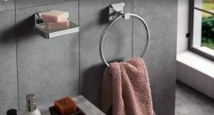 Аксессуары из второй группы состоят из двух частей – основы с отверстиями для крепления и самого кольца. Полотенце продевается сквозь кольцо и удерживается внутри него. Между собой эти принадлежности могут отличаться стилем исполнения и диаметром самого кольца.