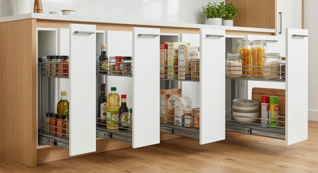 Узкие форматы чаще всего выбирают для бутылочниц и компактных систем рядом с плитой или мойкой. Они удобны, когда задача состоит в том, чтобы использовать узкое место максимально рационально и держать под рукой масло, уксус, соусы, специи или небольшие упаковки.