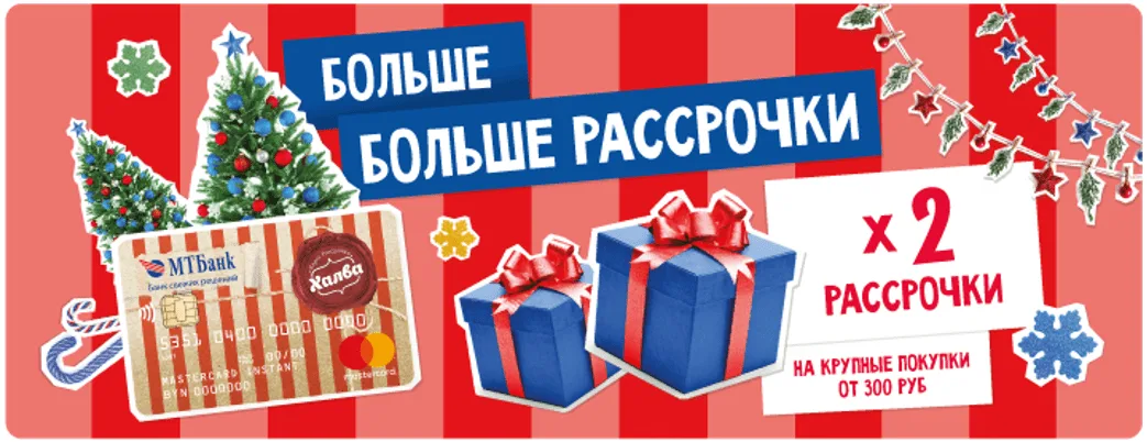 - Со 2 по 31 декабря выбирайте с размахом и совершайте крупные покупки в рассрочку по Халве на сумму от 300 руб. (в счет лимита овердрафта);