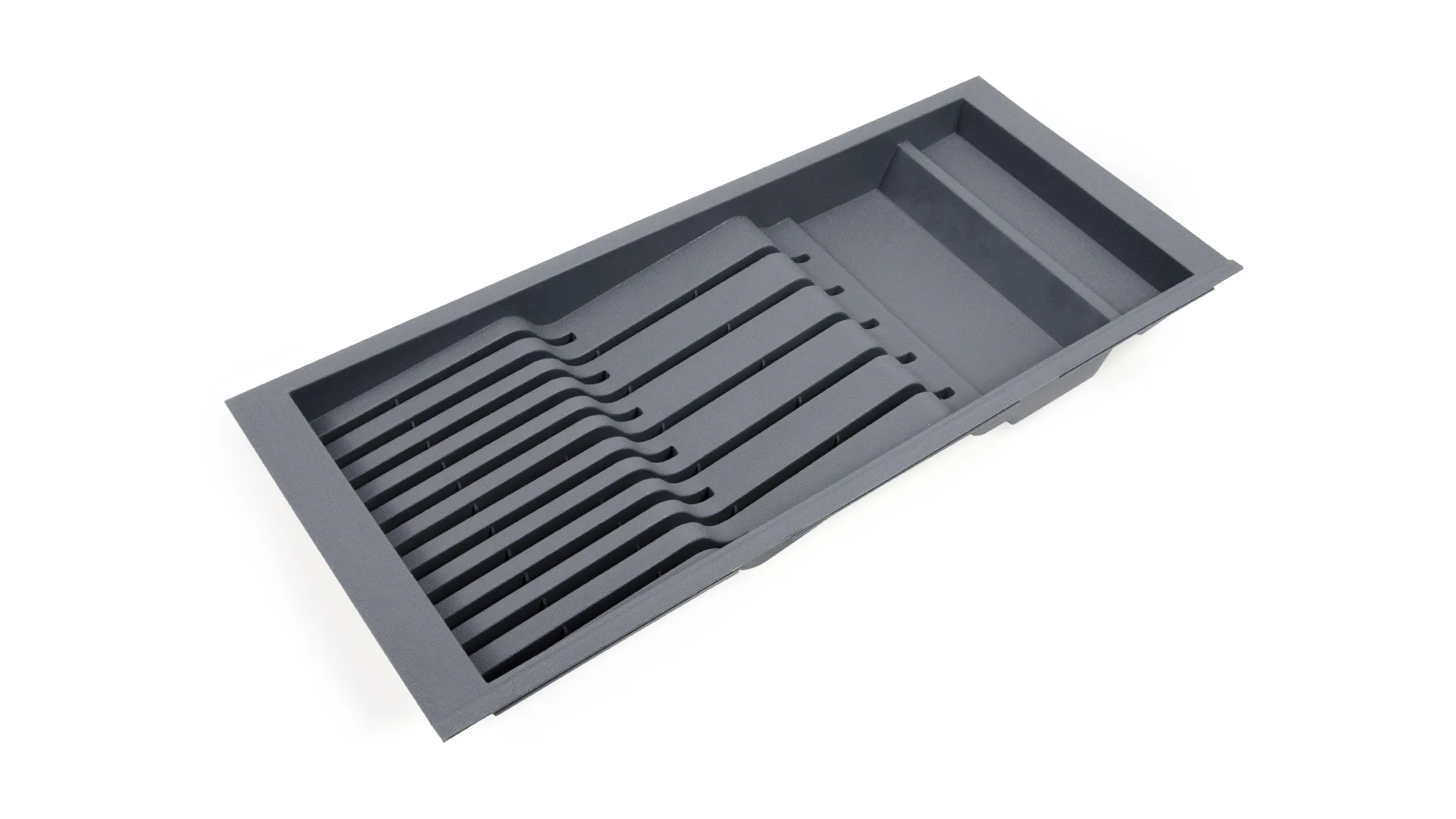PC15 — поддон из экологичного полипропилена, необходим для хранения ножей разных габаритов. Является составным элементом для формирования индивидуальной комбинации поддонов линейки BLӦKI для выдвижных мебельных ящиков глубиной 500 мм и шириной от 700 мм.