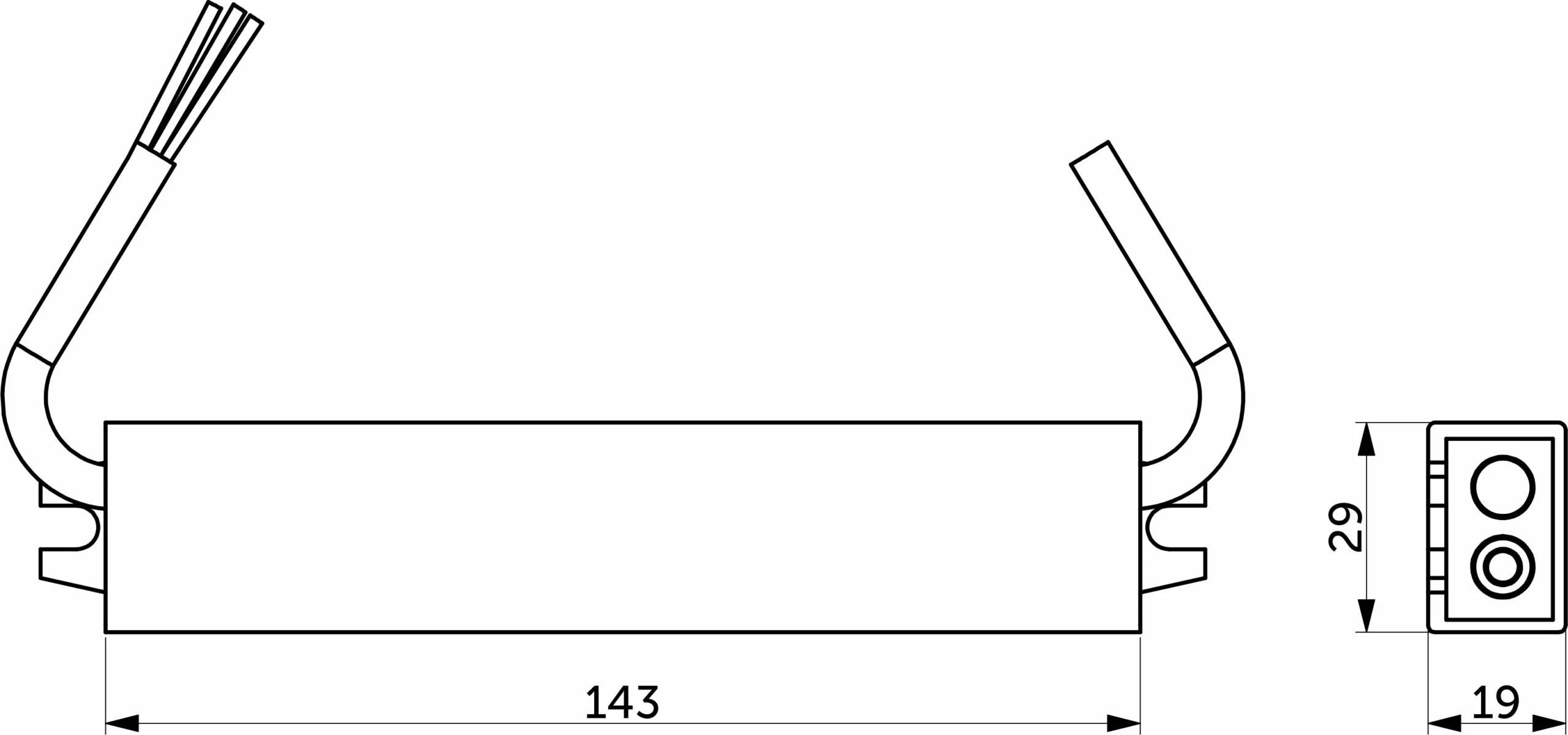 Размеры 143х29х19 мм. Вх.напряж. 110-240V AC, вых.напряж. 12V DC, мощность 36Вт, сила тока 3A, степень защиты IP67 влагостойкий.