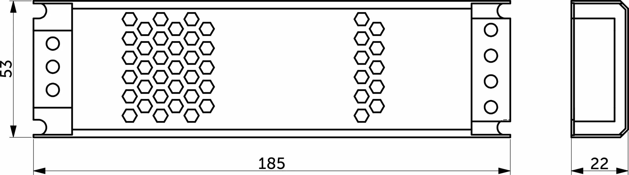 Размеры 185х53х22 мм, вх.напряж. 198-264V AC, вых.напряж. 12V DC, мощность 100Вт, сила тока 8,33A, степень защиты IP20.
