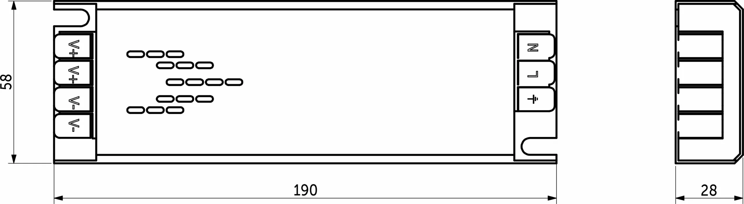 Размеры 190х58х28мм. Вх.напряж. 110-220V AC, вых напряж. 12V DC, мощность 150Вт, сила тока 12,5A, степень защиты IP20.