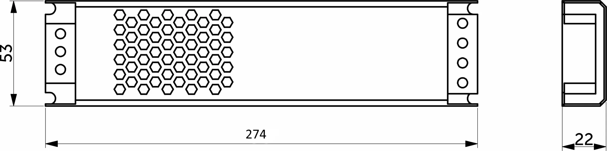 Размеры 274х53х22 мм, Вх.напряж. 198-264V AC, вых напряж. 12V DC, мощность 200Вт, сила тока 16,67A, степень защиты IP20.