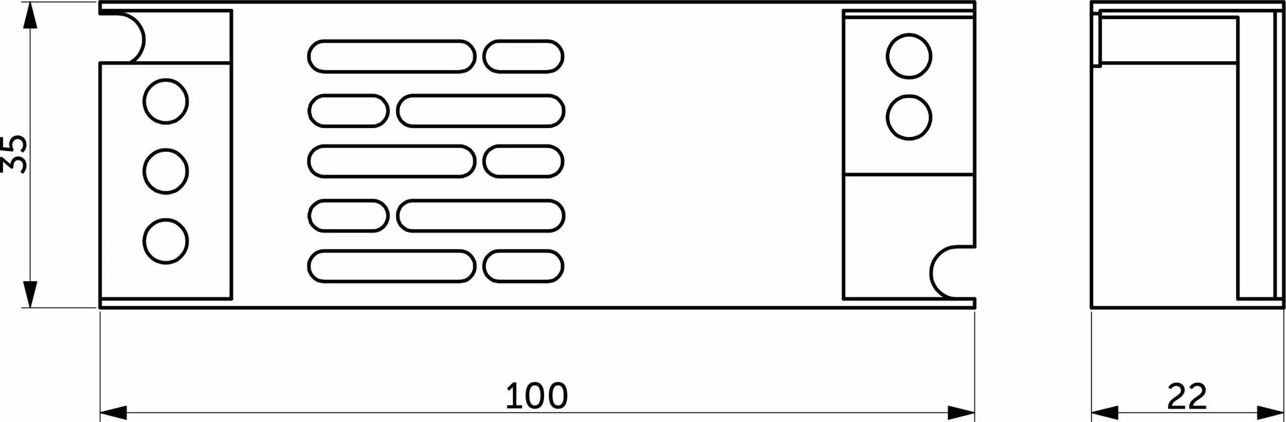 Размеры 100х35х22 мм, Вх.напряж. 176-264V AC, вых напряж. 12V DC, мощность 36Вт, сила тока 2,5A, степень защиты IP20.