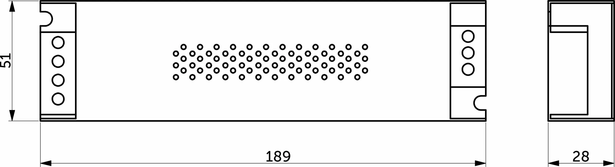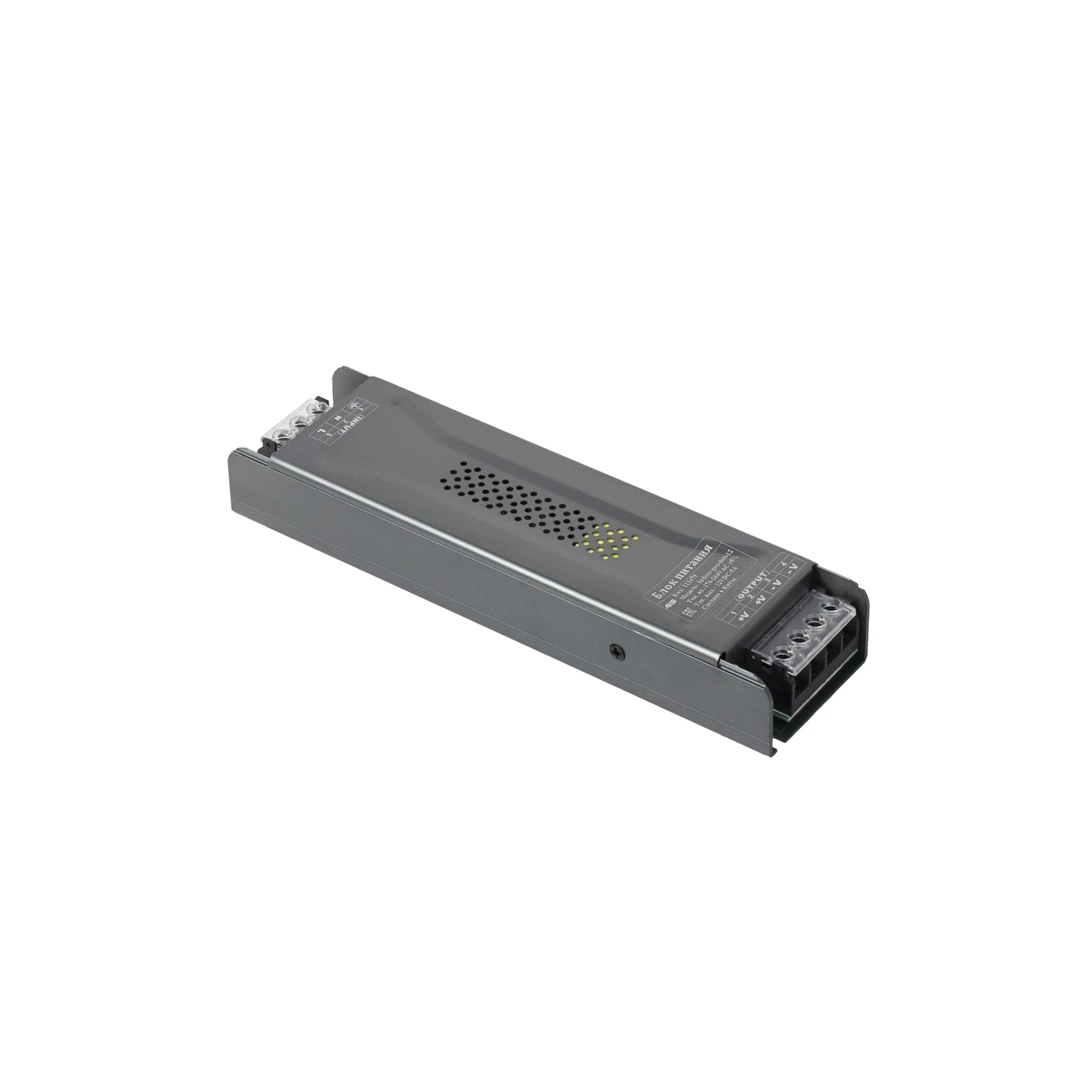 Размеры 189х51х28 мм. Вх.напряж. 176-264V AC, вых.напряж. 12V DC, мощность 60Вт, сила тока 5A, степень защиты IP20.