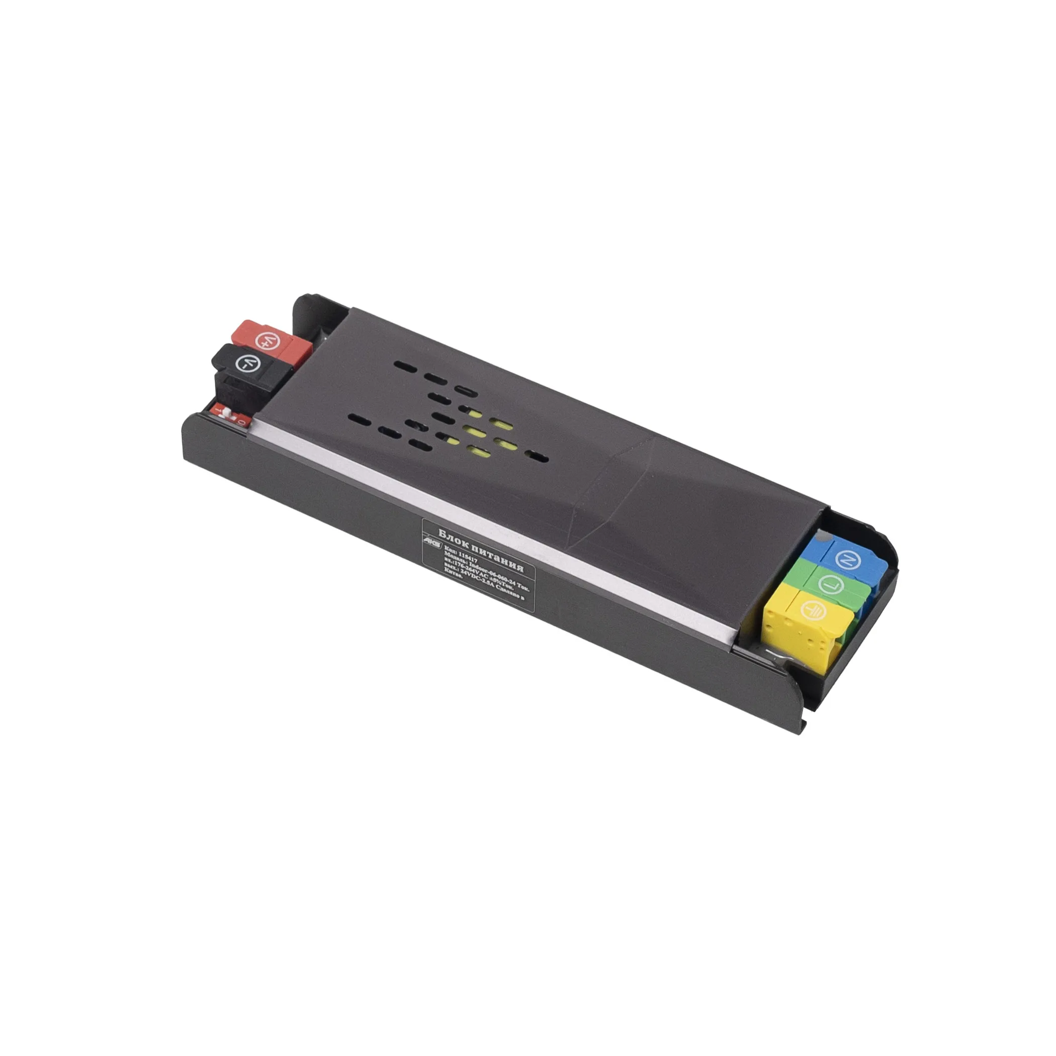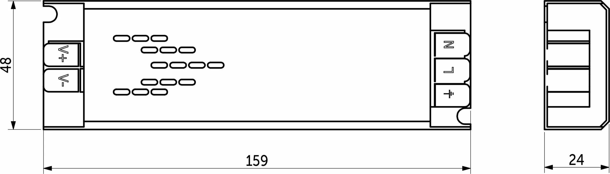 Размеры 159х48х24мм. Вх.напряж. 110-220V AC, вых напряж. 12V DC, мощность 60Вт, сила тока 5A, степень защиты IP20.