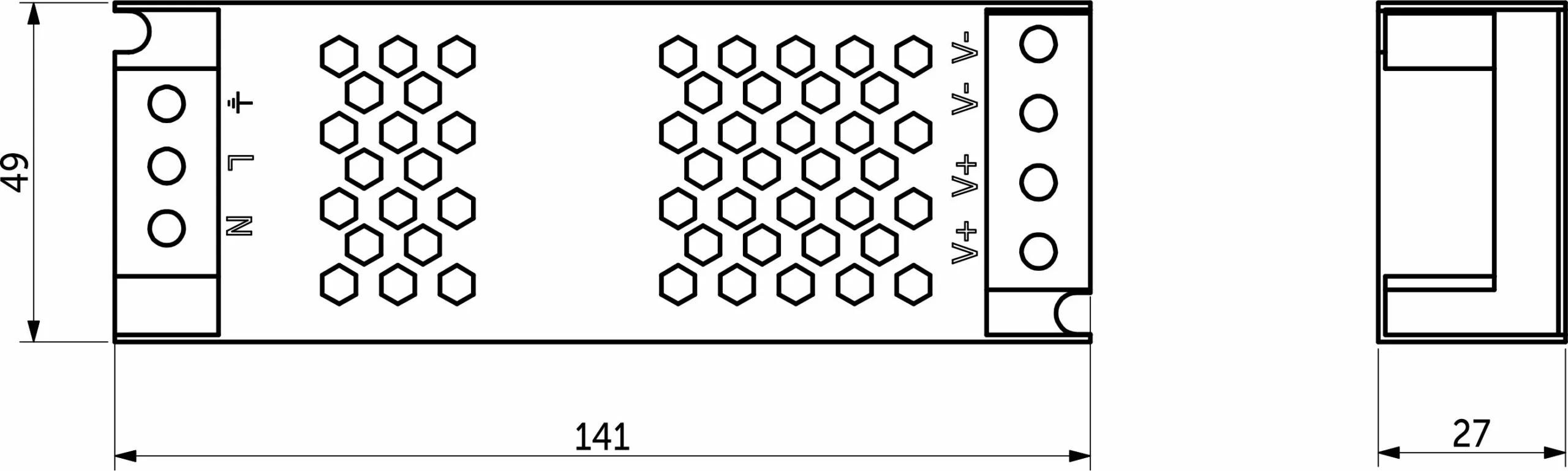 Размеры 141х49х27мм. Вх.напряж. 110-220V AC, вых напряж. 24V DC, мощность 60Вт, сила тока 2,5A, степень защиты IP20.
