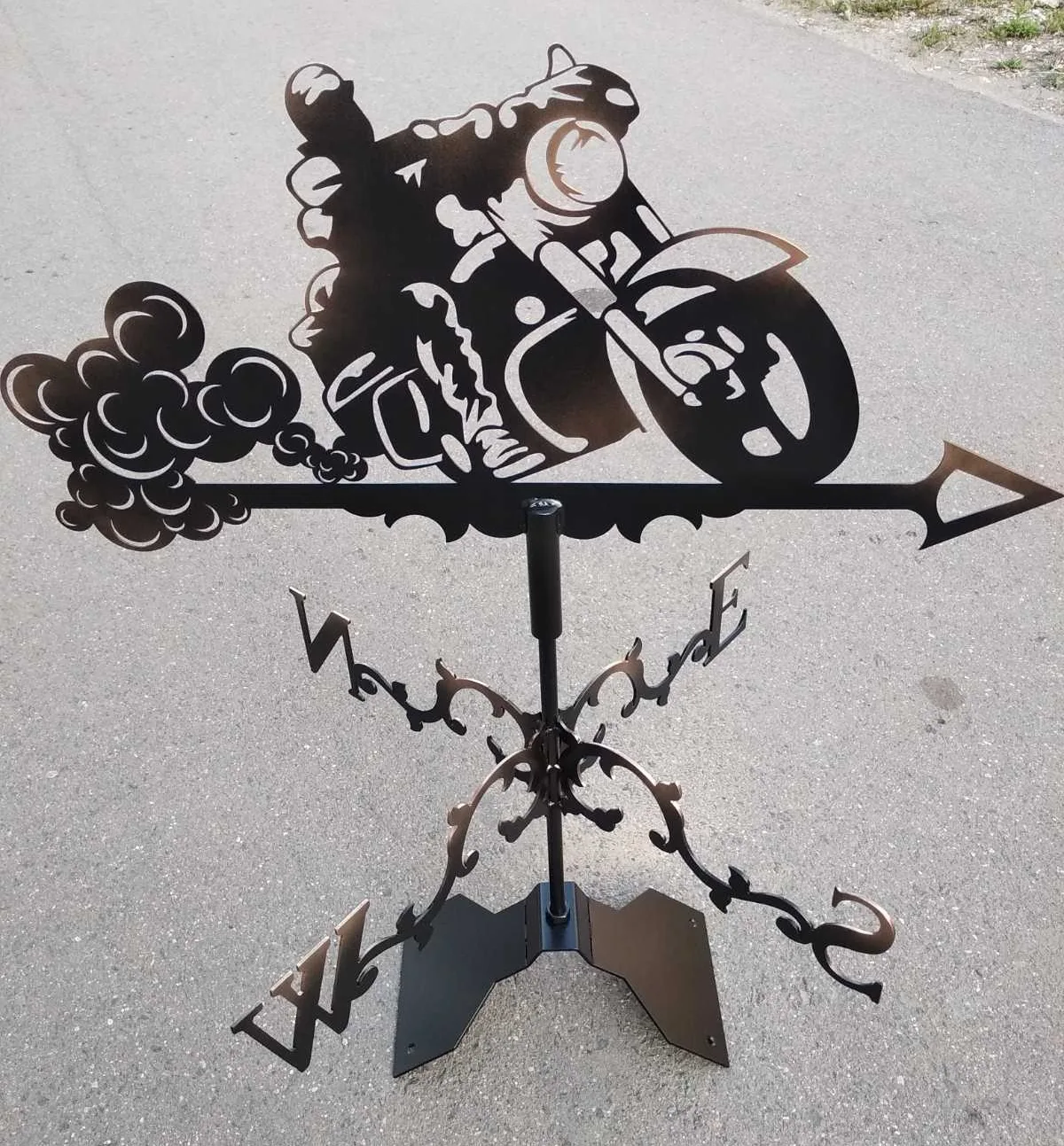 Флюгер «Мотоциклист» — это стильный и функциональный аксессуар, который станет украшением вашей крыши. Он выполнен из 2 мм стали и покрыт полимером, устойчивым к атмосферным осадкам. Поверх полимера нанесена золотистая краска, придающая флюгеру неповторимый вид.
