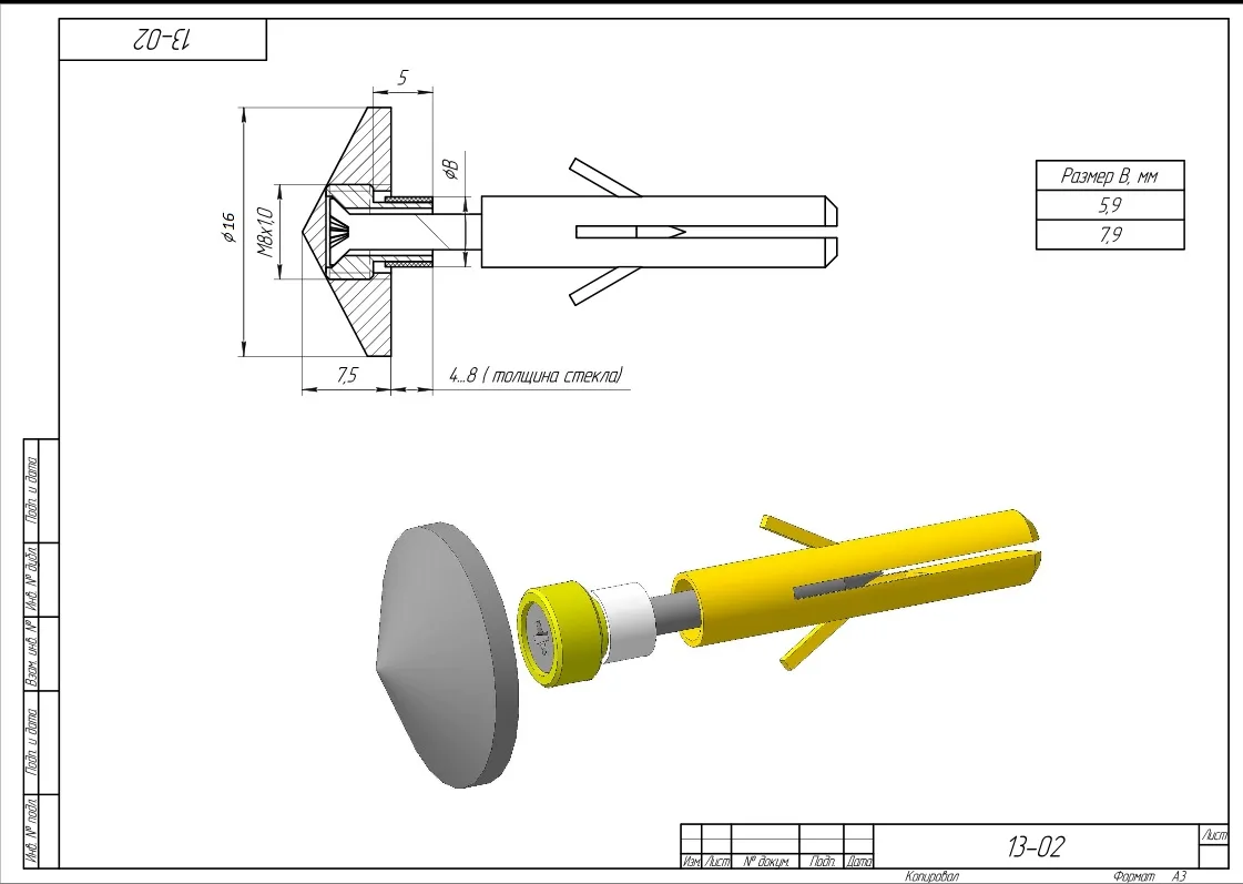Конусообразное крепление предназначено для зеркал толщиной 4–8 мм и диаметром 16 мм. Для удобства монтажа в комплект входит пластиковая втулка диаметром 5,9 мм. Также в комплекте есть дополнительная латунная шайба с резьбой.