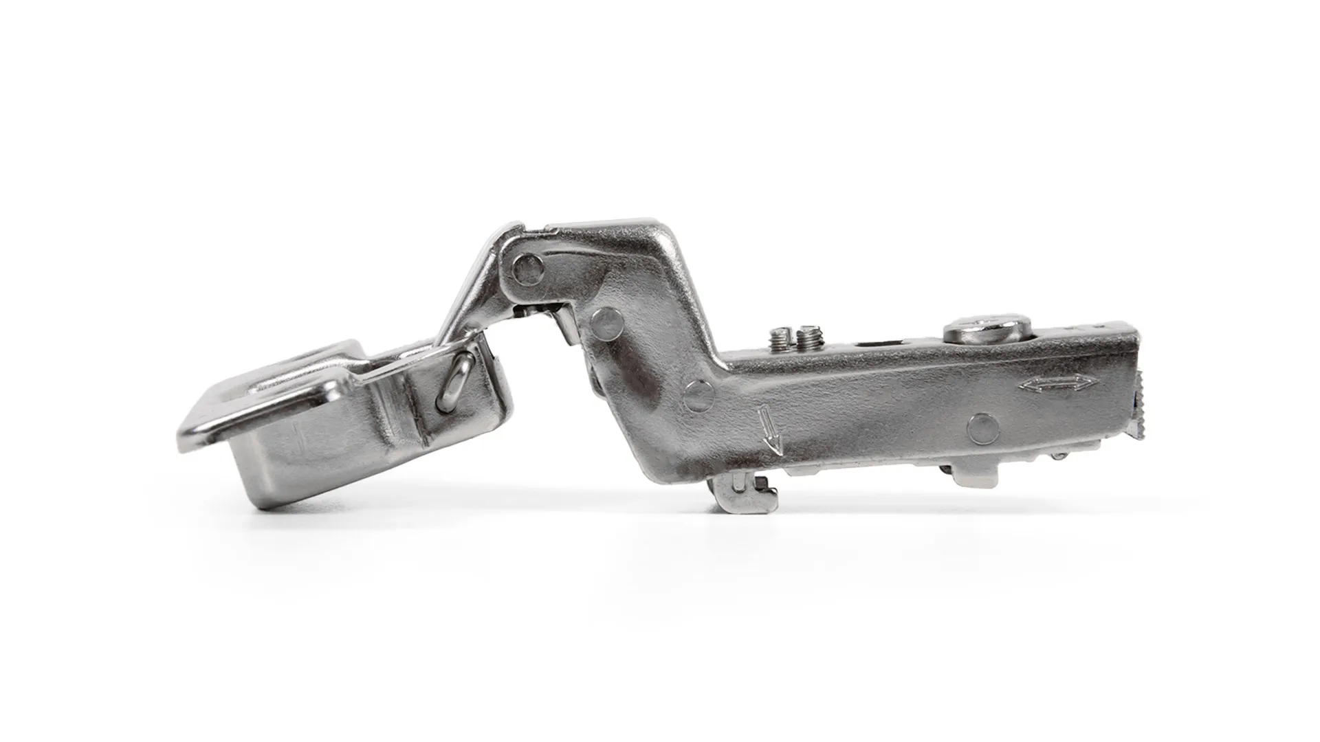 Модель имеет регулировку фасада в трёх плоскостях (по глубине, горизонтали и вертикали). Удобная регулировка по высоте и глубине в одно действие осуществляется при помощи эксцентрикового винта, встроенного в корпус петли. Регулировка фасада по горизонтали доступна при помощи винтов на планке.