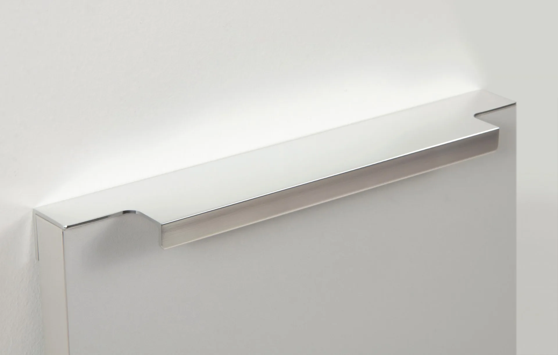 Ручка имеет богатую палитру цветовых решений и разнообразие длин. В зависимости от длины, модель допускает размещение двумя способами — «в размер» фасада и по центру широких фасадов (как большой «язычок»).