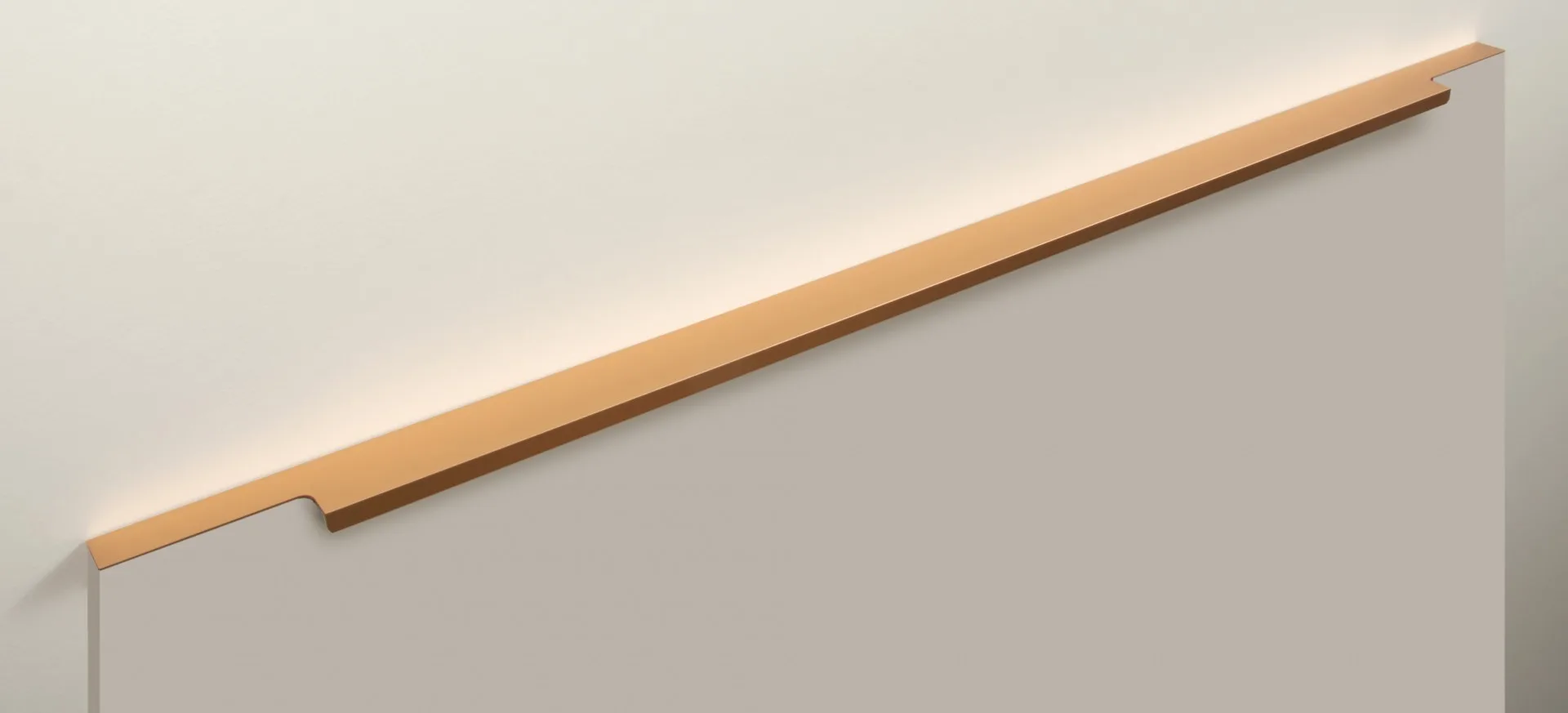 Ручка имеет богатую палитру цветовых решений и разнообразие длин. В зависимости от длины, модель допускает размещение двумя способами — «в размер» фасада и по центру широких фасадов (как большой «язычок»).
