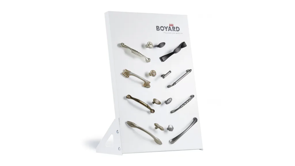 Металлический демонстрационный планшет S901 — планшет для демонстрации мебельных ручек BOYARD в шоурумах и мебельных салонах. Продукция крепится на планшет с помощью магнитов. Благодаря этому очень легко и быстро можно менять экспозиции и примерять модели на фасады, что упрощает процесс выбора лицевой фурнитуры для мебельных проектов.