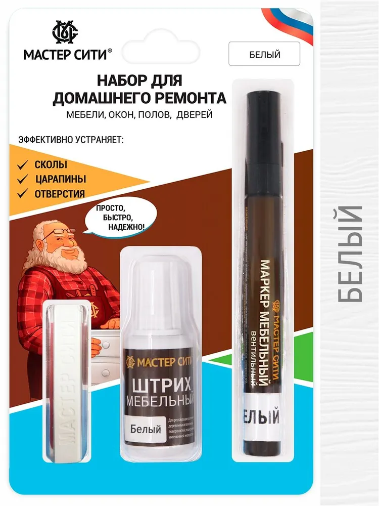 Набор для домашнего ремонта и реставрации белой мебели от ведущего российского производителя Мастер Сити. Набор для ремонта мебели состоит из мебельного мягкого воска, штриха для мебели и вентильного маркера. Набор для ремонта мебели без инструментов! Легок в использовании, маскирует повреждения, обновляет и улучшает внешний вид мебели. С помощью мягкого мебельного воска, мебельного штриха и маркера можно устранить повреждения на ЛДСП, МДФ, массиве дерева, пластике. Штрихом и маркером для мебели закрашивайте неглубокие царапины, восковым мелком устраняйте средние и глубокие повреждения. Все продукты, входящие в набор, быстро сохнут, не дают усадки и не меняют цвет со временем. Составы укрывистые благодаря повышенному содержанию белого пигмента. Яркий, насыщенный цвет позволяет закрасить повреждение в 1-2 слоя. Используйте набор для ремонта повреждений на столах и другой мебели, дверях, плинтусах, окнах, подоконниках, ламинате и других покрытиях, где нет интенсивной нагрузки. Каждый продукт из набора вы можете использовать отдельно или вместе для достижения наилучшего результата. В комплекте шпатель. Подробную инструкцию читайте на упаковке.
