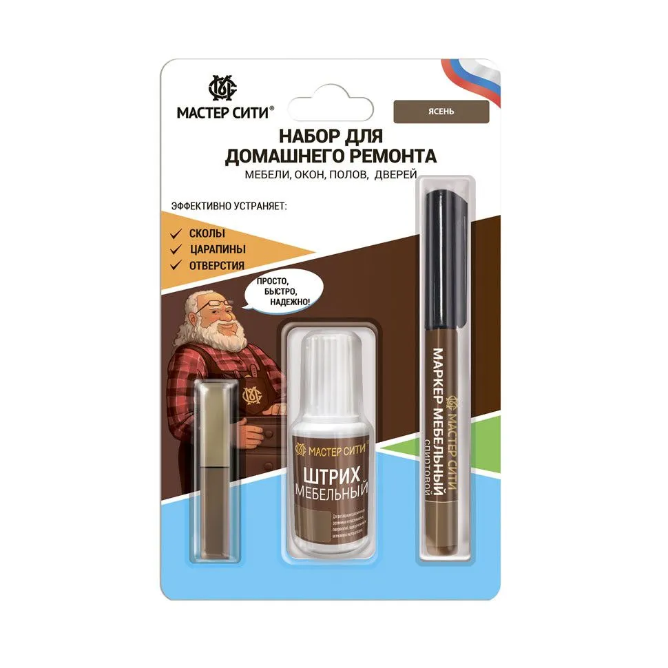 Набор для домашнего ремонта и реставрации белой мебели от ведущего российского производителя Мастер Сити. Набор для ремонта мебели состоит из мебельного мягкого воска, штриха для мебели и вентильного маркера. Набор для ремонта мебели без инструментов! Легок в использовании, маскирует повреждения, обновляет и улучшает внешний вид мебели. С помощью мягкого мебельного воска, мебельного штриха и маркера можно устранить повреждения на ЛДСП, МДФ, массиве дерева, пластике. Штрихом и маркером для мебели закрашивайте неглубокие царапины, восковым мелком устраняйте средние и глубокие повреждения. Все продукты, входящие в набор, быстро сохнут, не дают усадки и не меняют цвет со временем. Составы укрывистые благодаря повышенному содержанию белого пигмента. Яркий, насыщенный цвет позволяет закрасить повреждение в 1-2 слоя. Используйте набор для ремонта повреждений на столах и другой мебели, дверях, плинтусах, окнах, подоконниках, ламинате и других покрытиях, где нет интенсивной нагрузки. Каждый продукт из набора вы можете использовать отдельно или вместе для достижения наилучшего результата. В комплекте шпатель. Подробную инструкцию читайте на упаковке.