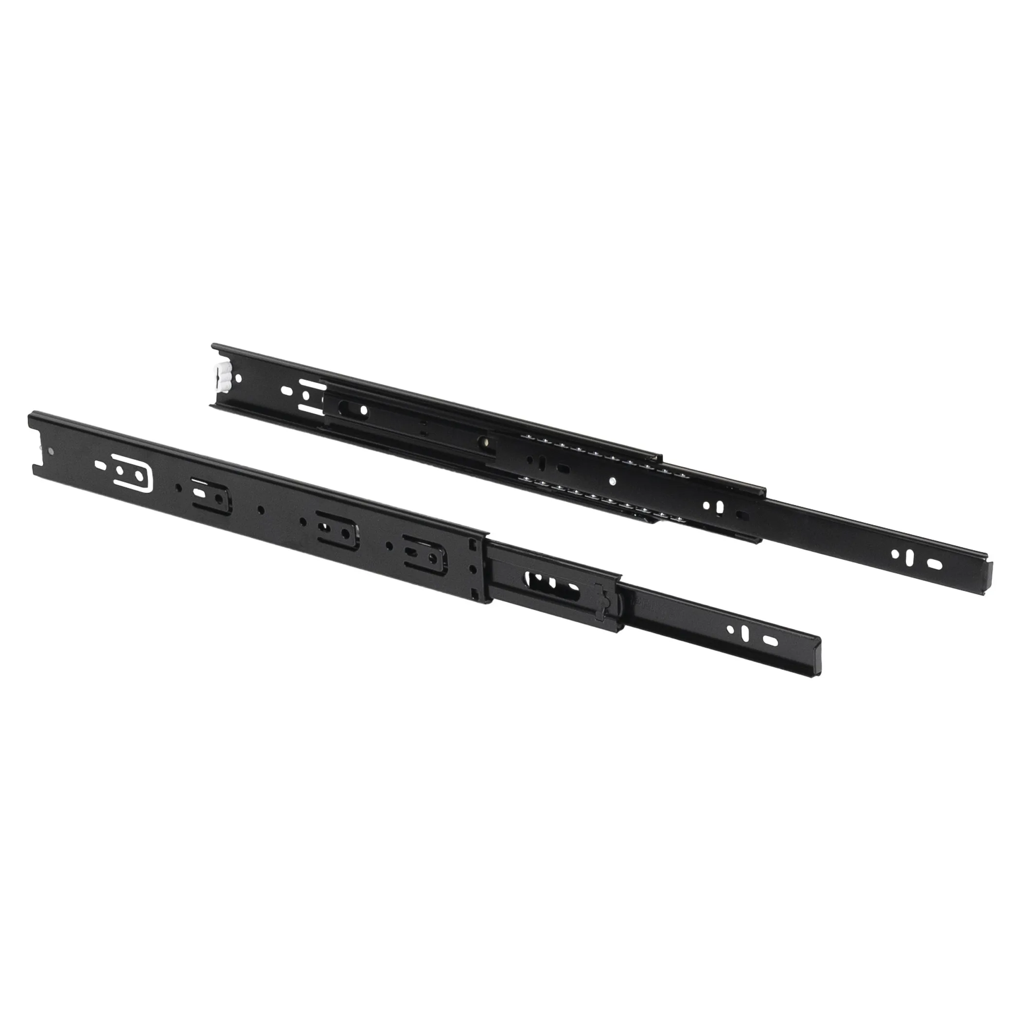 Это шариковая направляющая без доводчика с высотой профиля 45 мм. Модель выполнена из холоднокатаной стали, заявленная толщина стали — 1.0*1.0*1.2 мм. Направляющая рассчитана на полное выдвижение, поэтому содержимое ящика остается доступнее, чем при частичном ходе.