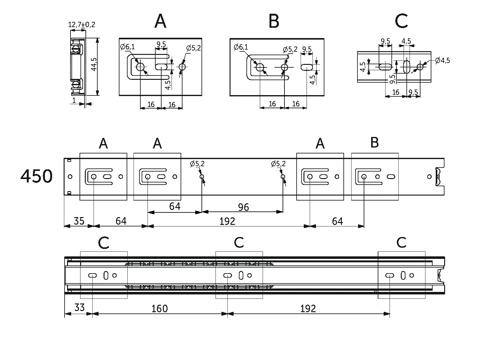 Если вы подбираете направляющую под конкретную глубину корпуса, ориентируйтесь прежде всего на фактический размер мебели и желаемый ход выдвижения. В этой серии 450 мм — не универсальный «средний» вариант, а размер для более глубоких ящиков, где важно раскрыть полезный объем без перехода к еще более длинному формату.