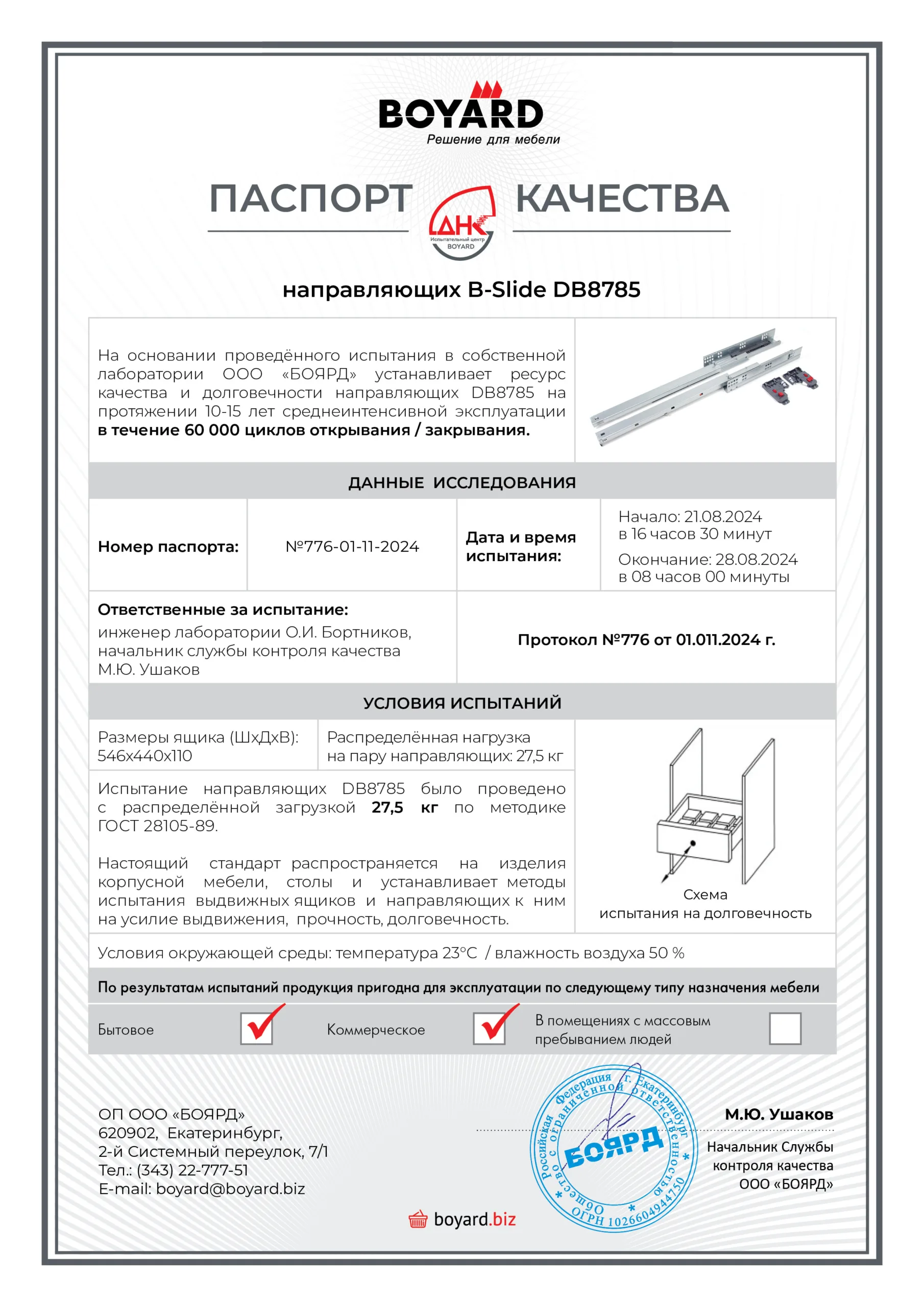 B-Slide DB8785 — базовые направляющие скрытого монтажа полного выдвижения с открытием от нажатия и выверенным набором опций и возможностей для мебельных производителей.