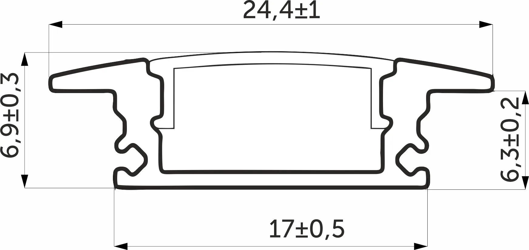 Врезной профиль, ширина части под фрезеровку 17 мм, высота 7 мм, матовый экран, длина 2м., внутренняя часть вмещает ленту шириной до 12 мм.