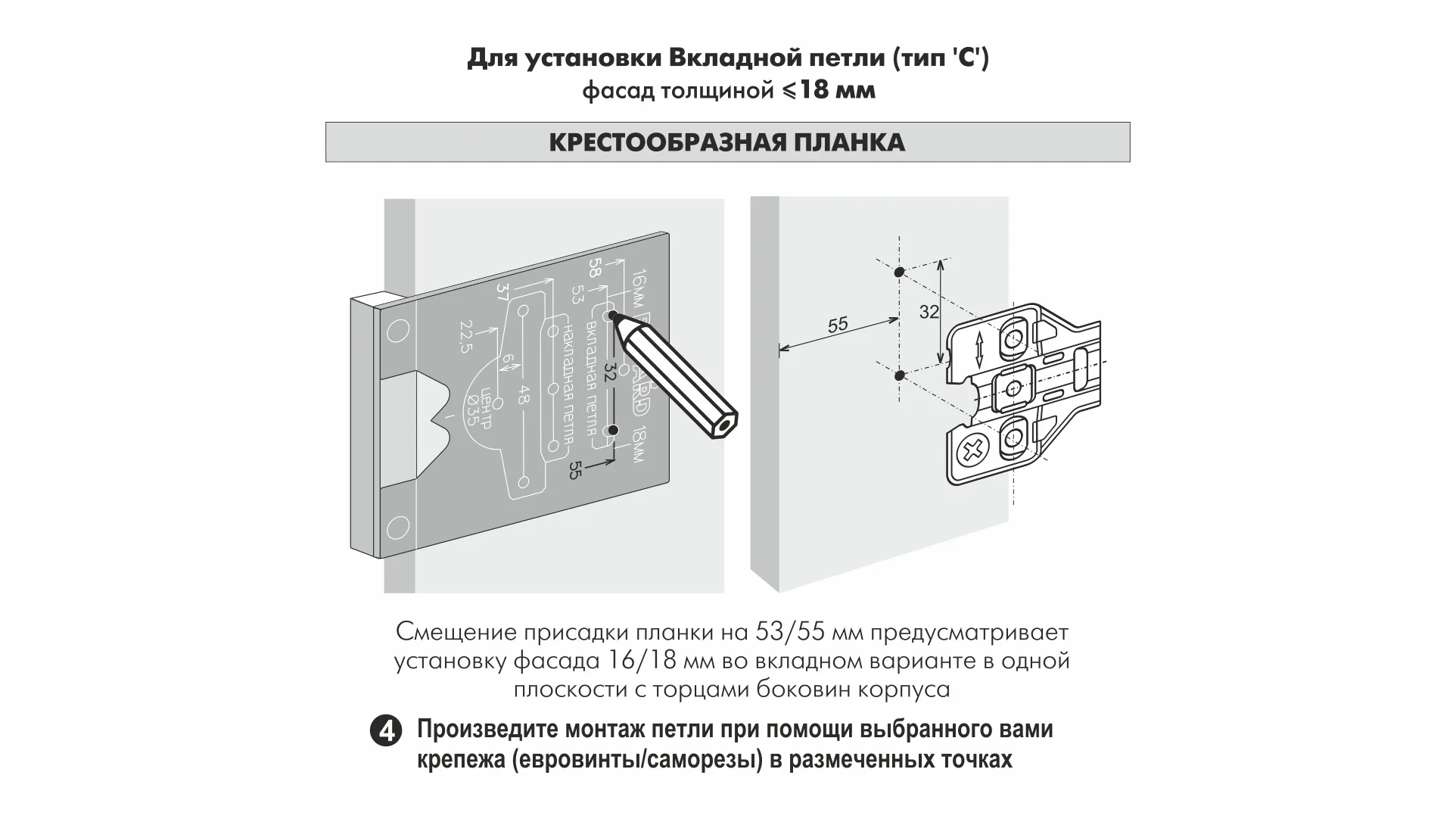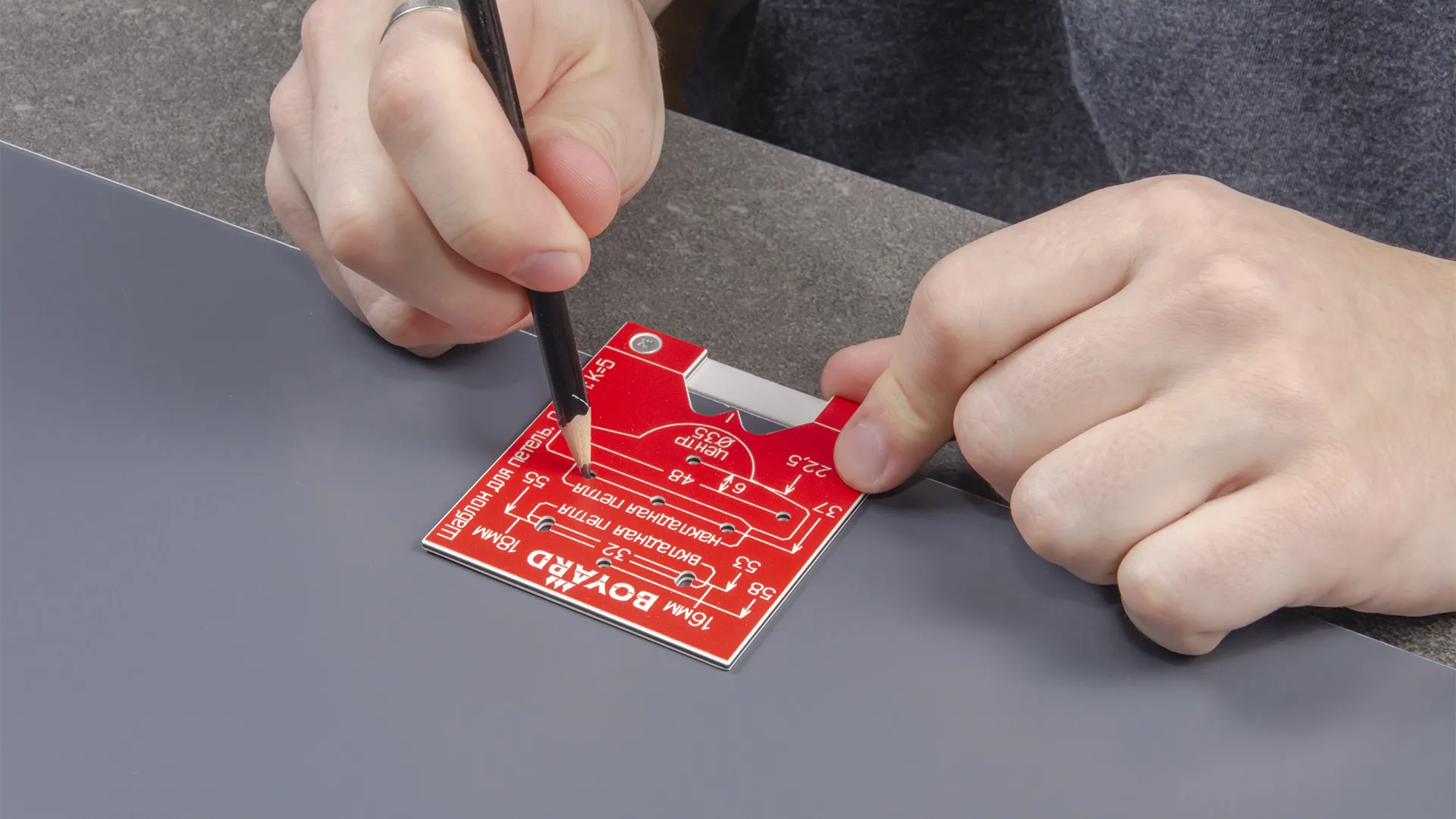 S908 — разметочный шаблон для петель с расстоянием до центра сверления под чашку K=5. Позволяет выполнять точную разметку отверстий для установки фурнитуры, что значительно упрощает последующий монтаж. Может использоваться как в индивидуальном, так и в серийном производстве мебели.