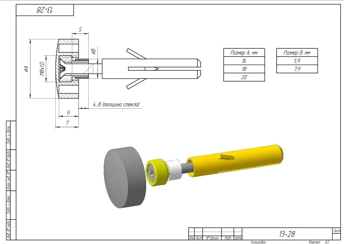 Крепление предназначено для установки зеркала с высверливанием в нём отверстия. Толщина зеркала должна составлять 4–8 мм, диаметр отверстия — 6–8 мм.