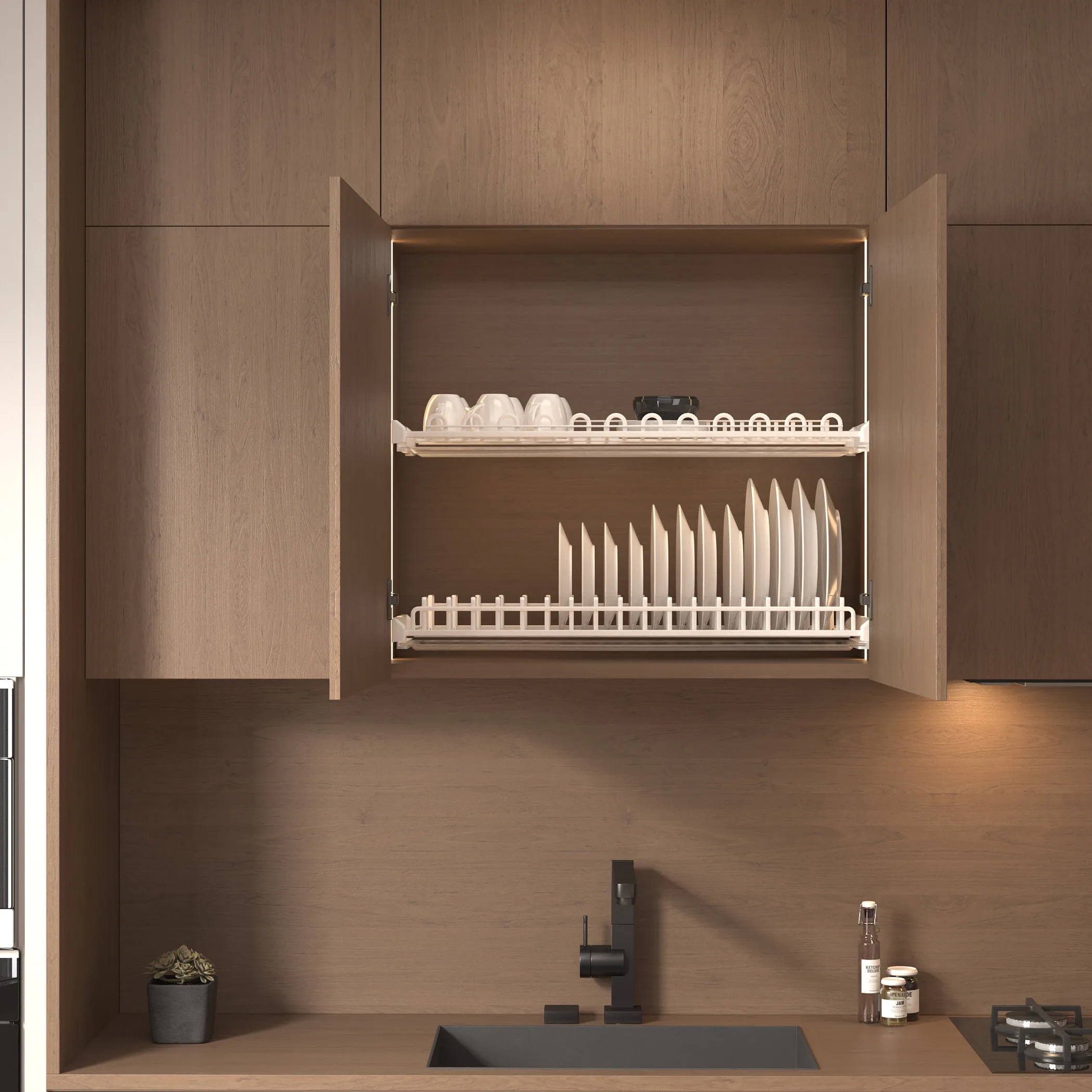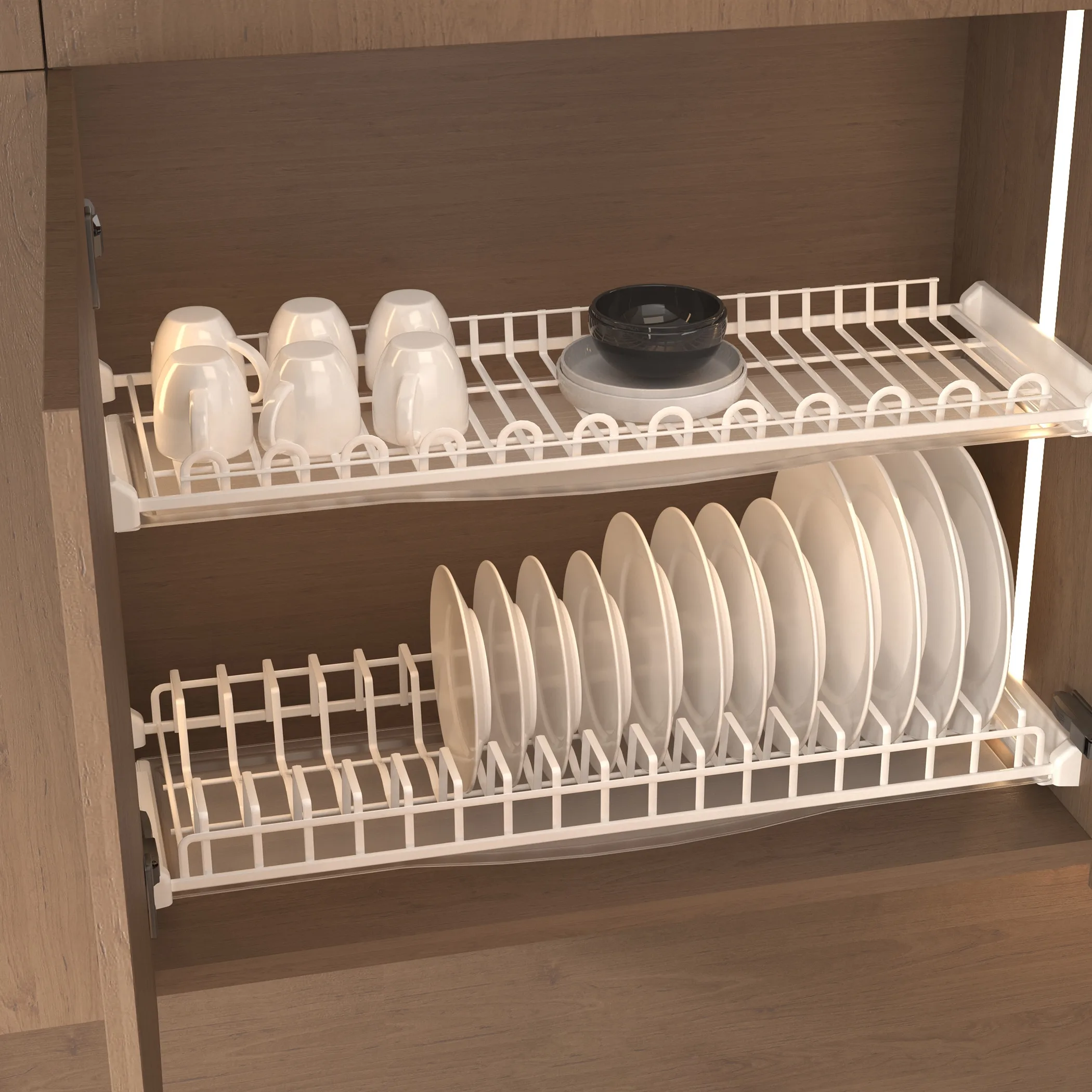Такая сушка помогает организовать пространство внутри кухонного шкафа, обеспечивает удобный доступ к посуде и поддерживает порядок после мытья. Белый цвет делает изделие особенно удачным решением для светлых кухонь, где важна визуальная чистота даже внутри мебели.