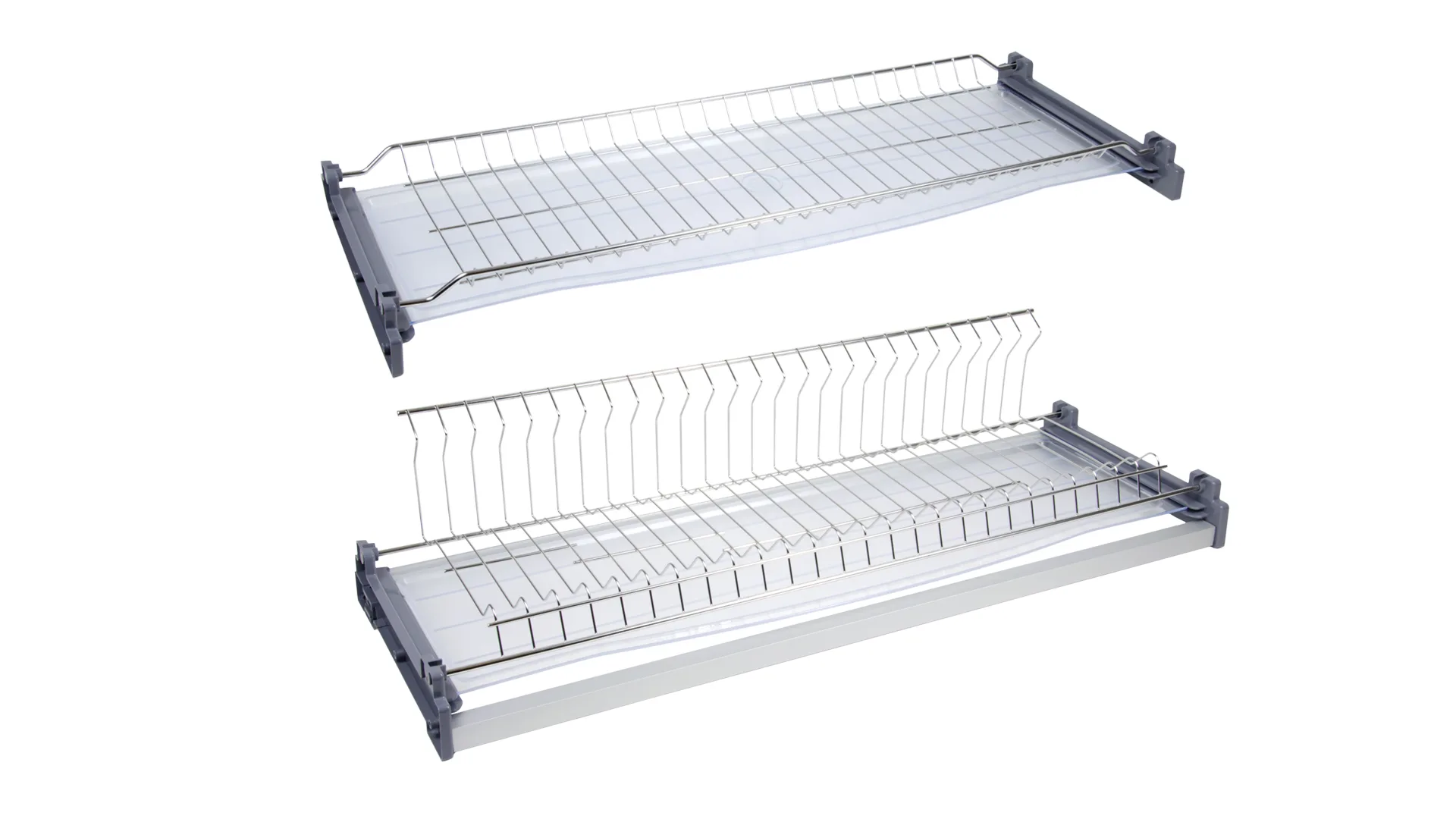 LORA SU06 — двухуровневая сушка для посуды из нержавеющей стали с нижним ярусом L-образной формы для более стабильного удержания разноформатных тарелок. Модель имеет два плотных поддона под каждым уровнем для сбора капель воды, стекающих с посуды. Нижний ярус оснащён поперечным прутком, который препятствует проваливанию маленьких блюдец.