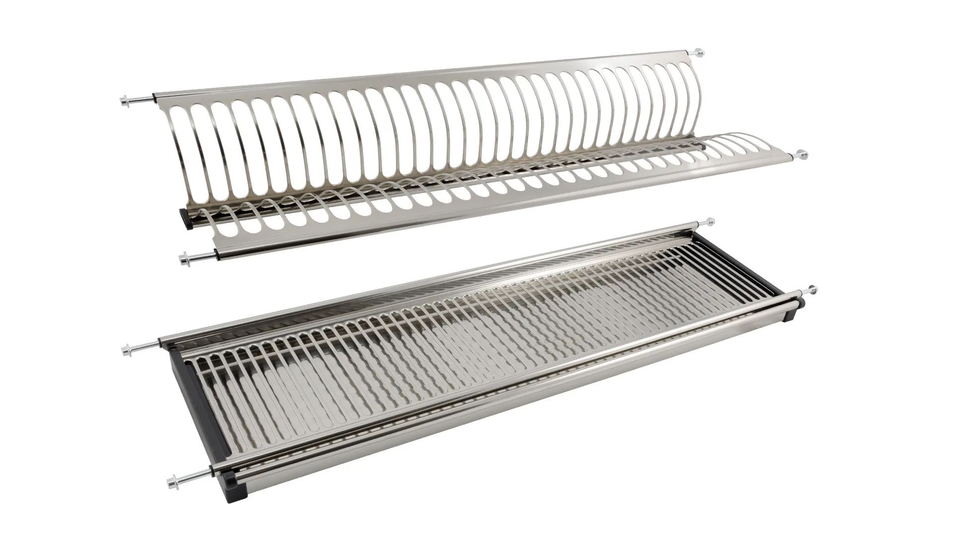 Двухуровневая сушка для посуды быстрого монтажа для современных кухонных гарнитуров позволяет размещать значительное количество вымытой посуды. Модель оснащена стальным поддоном для сбора стекающих с посуды капель воды. Одно из достоинств сушки – быстрый монтаж: конструкция монтируется в предварительно просверленные отверстия. Материал конструкции – нержавеющая сталь и пластик.
