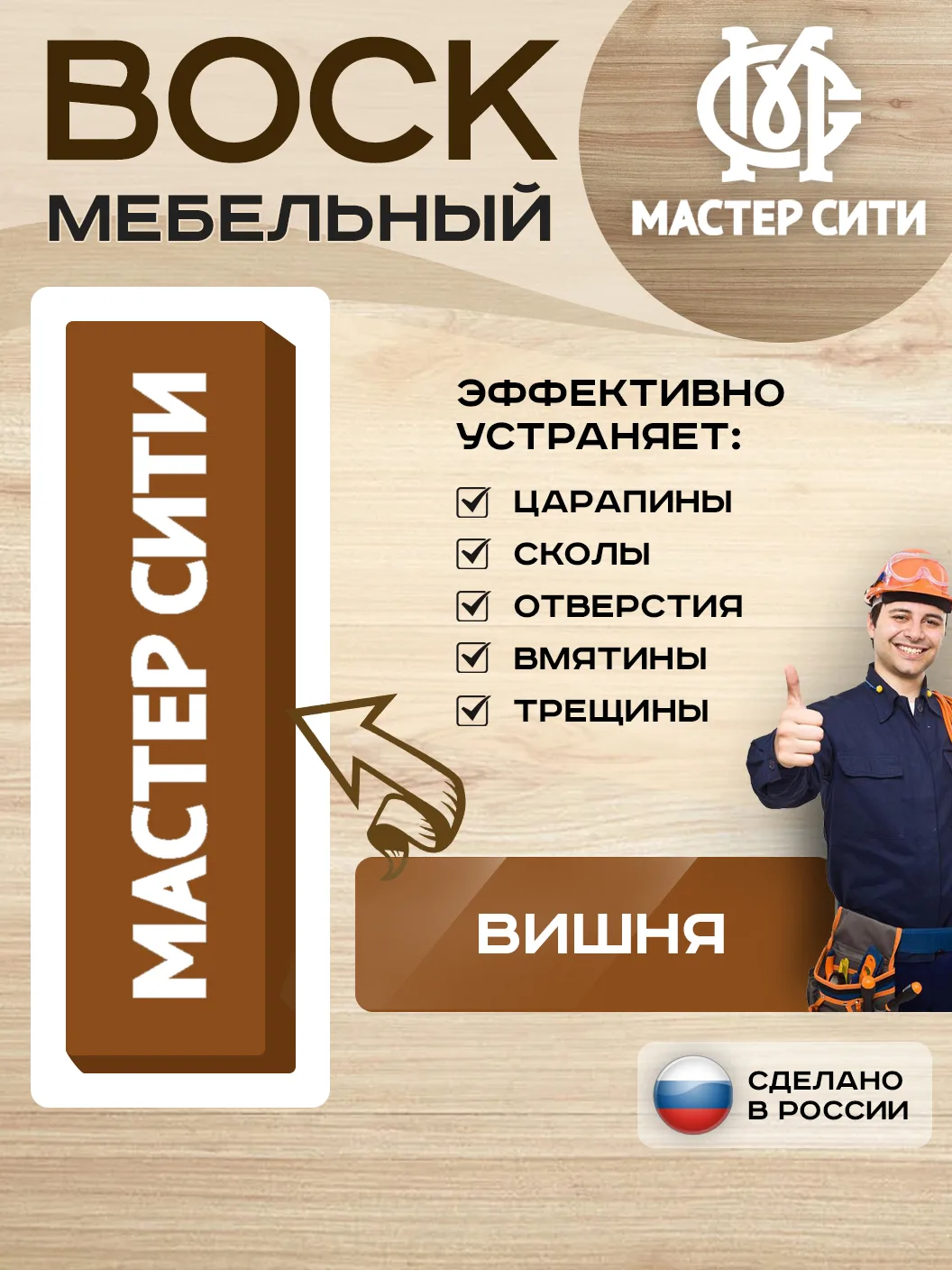 Мягкий мебельный воск цвета вишня от бренда МАСТЕР СИТИ предназначен для быстрого и лёгкого восстановления малых, средних и больших повреждений на различных деревянных и пластиковых поверхностях, не подверженных интенсивной эксплуатации. Подходит для ЛДСП, МДФ, фанеры, массива дерева, ламината, пластика и пробкового покрытия.