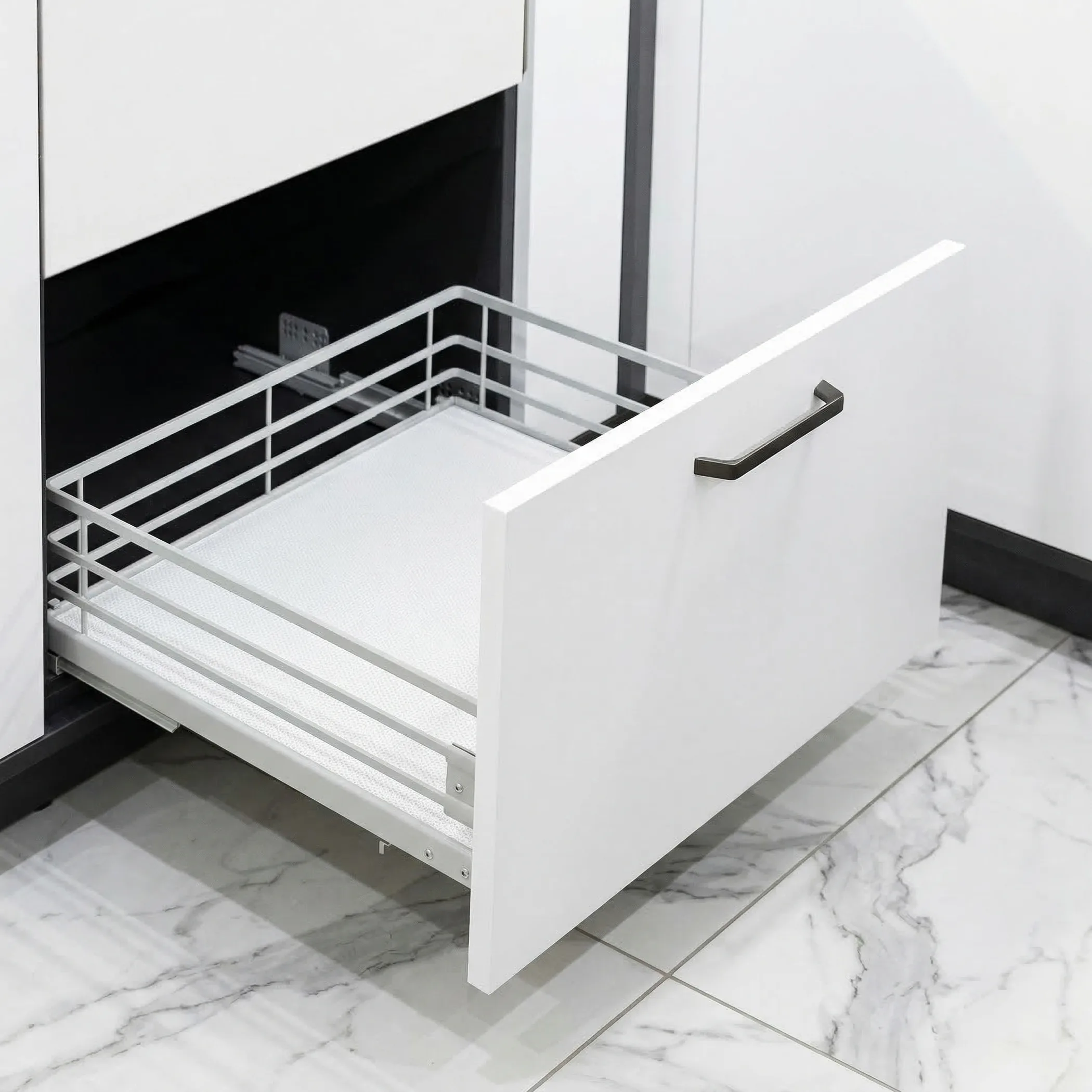 Главное преимущество такой корзины — удобный полный доступ к содержимому. Больше не нужно искать нужную кастрюлю в глубине шкафа: корзина плавно выдвигается, а доводчик обеспечивает мягкое и тихое закрывание.