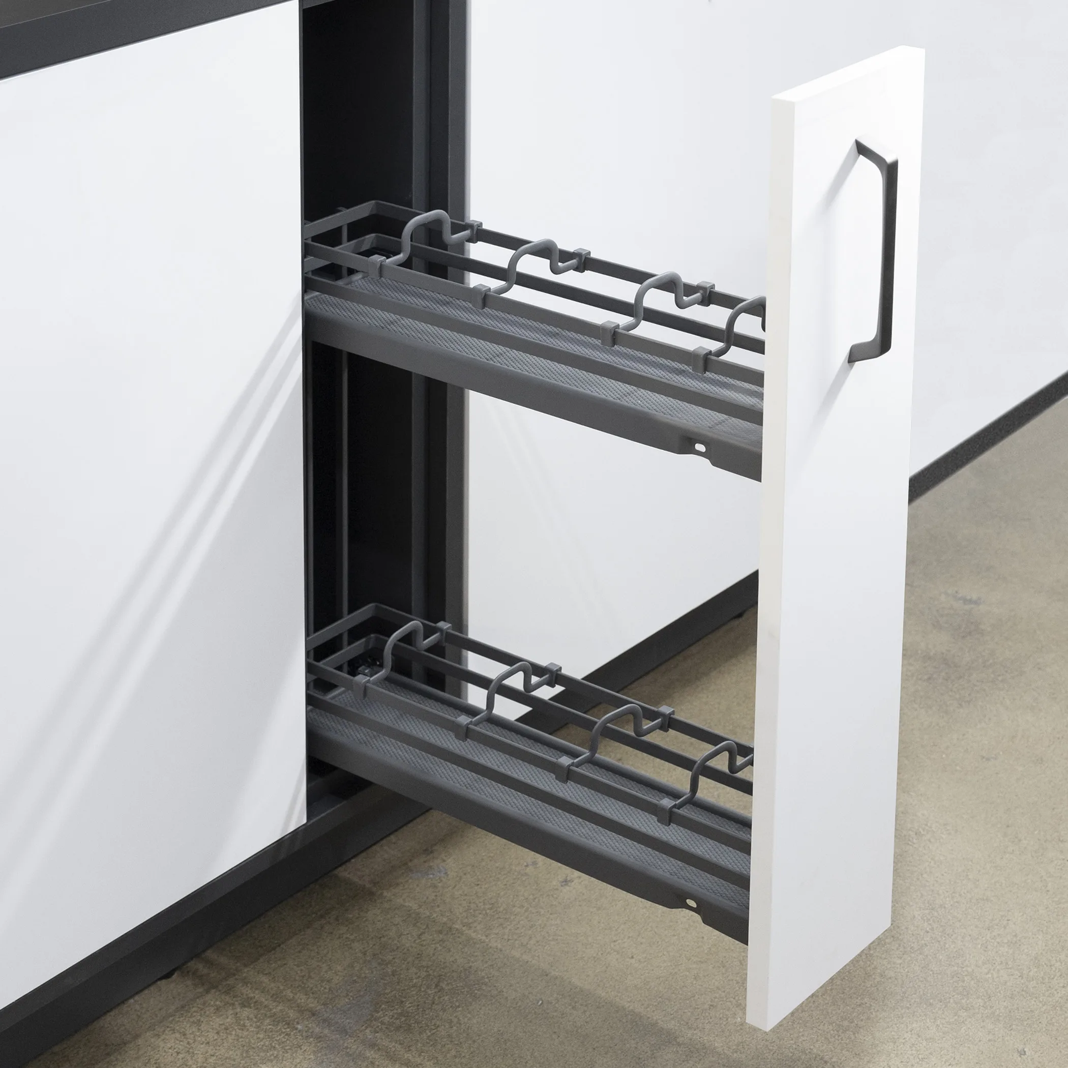 Продуманная конструкция корзин помогает организовать хранение банок, бутылок, столовой посуды, продуктов на кухне.