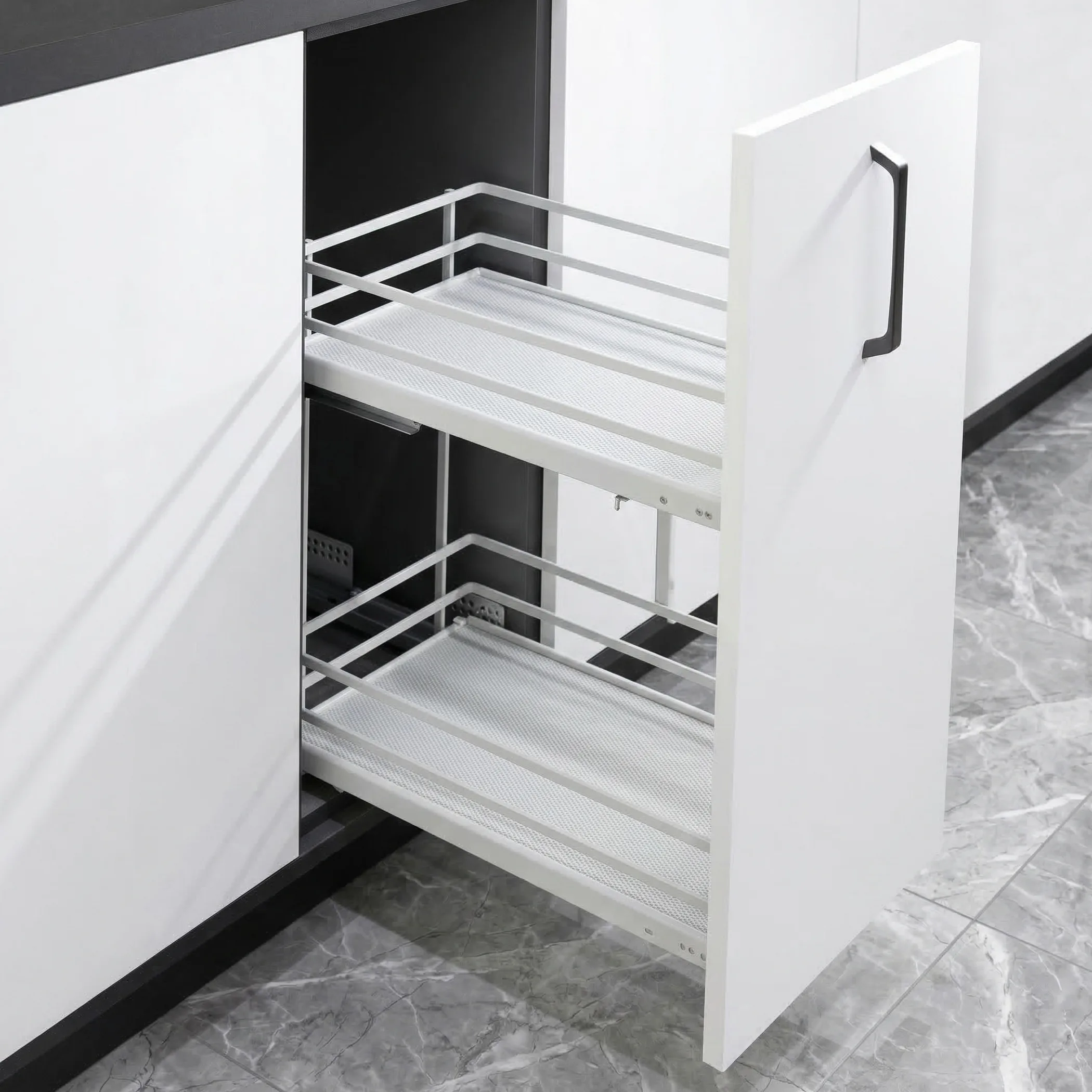 Такое карго особенно удобно в нижних кухонных модулях. Оно помогает собрать продукты и кухонные мелочи в одном месте, освободить полки и сделать хранение более понятным.