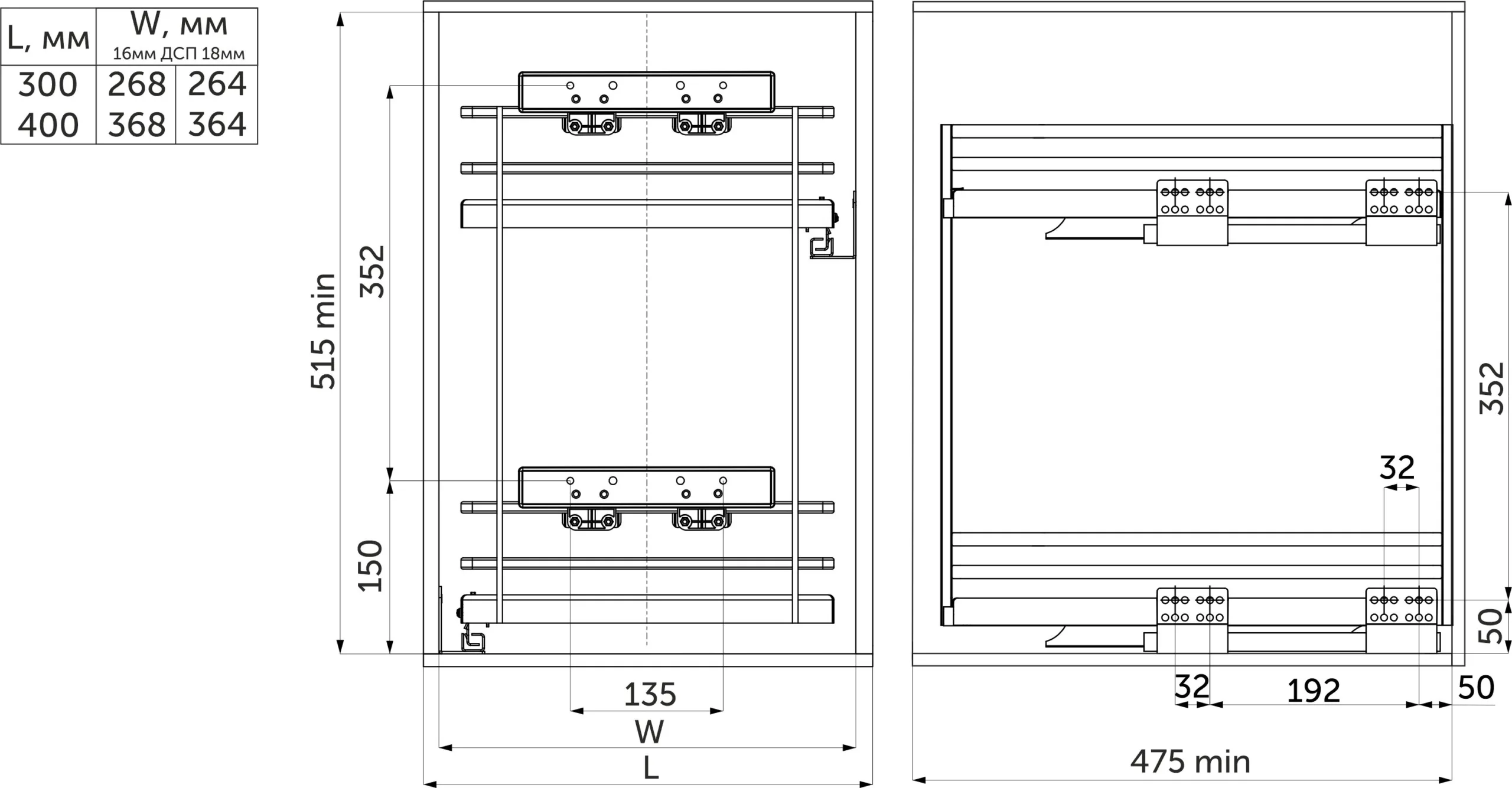 Возможность установки: в ящик под выдвижной или распашной фасад.