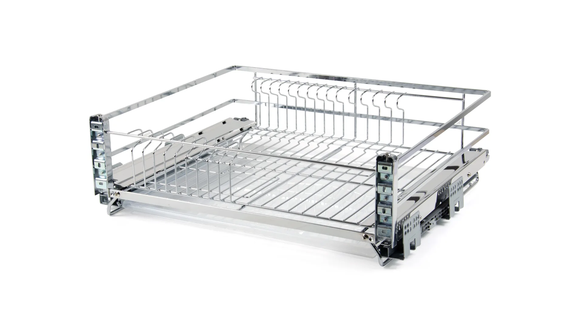 MIRA KRS06 — выдвижная корзина-сушка в эксклюзивном дизайне с плоским прутком с амортизацией, предназначена для хранения разноплановой посуды в нижней базе мебельного гарнитура.