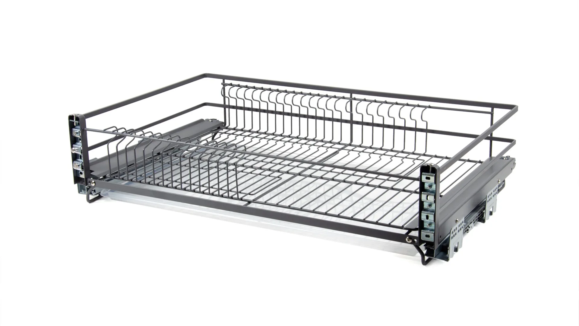 MIRA KRS06 — выдвижная корзина-сушка в эксклюзивном дизайне с плоским прутком с амортизацией, предназначена для хранения разноплановой посуды в нижней базе мебельного гарнитура.