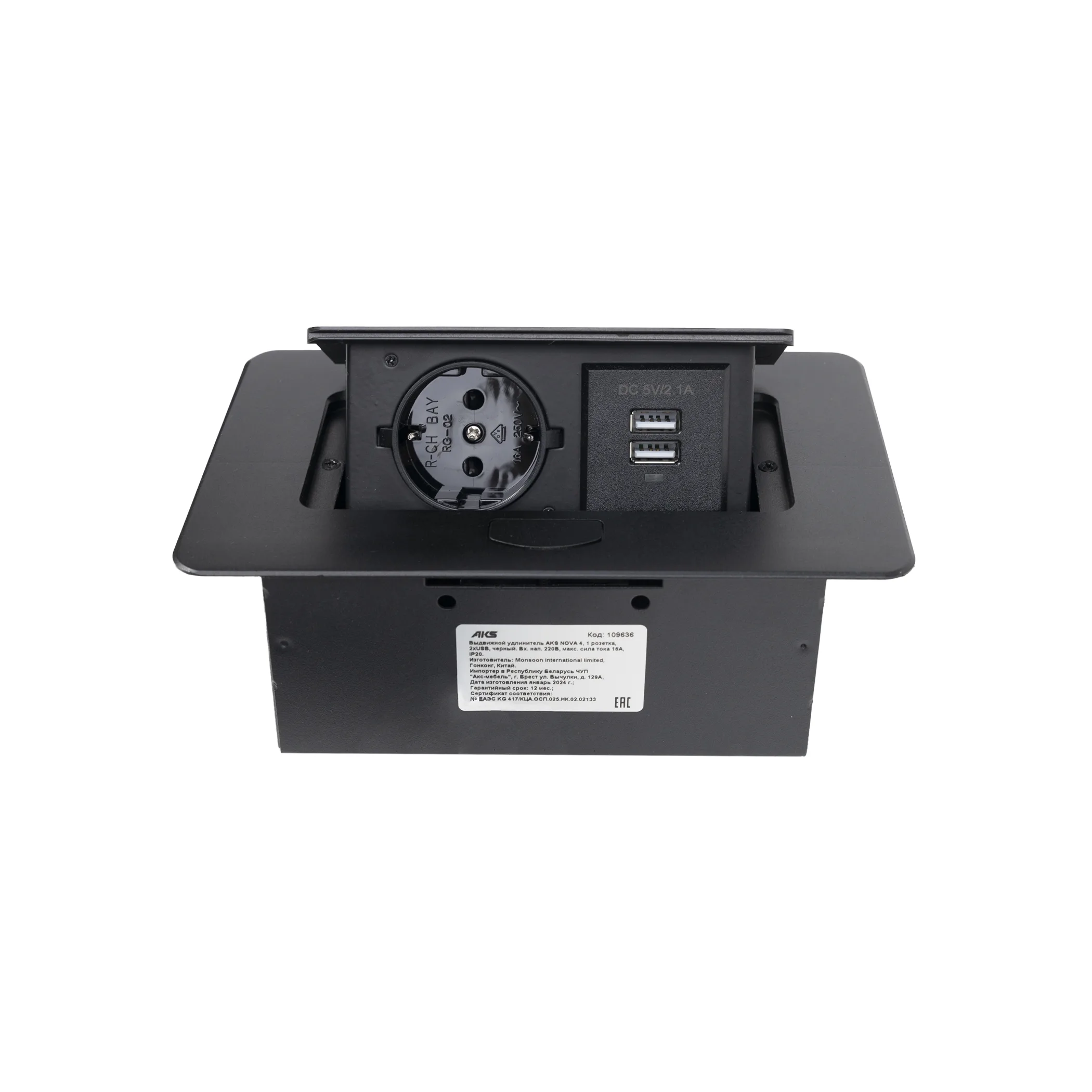 Выдвижной удлинитель Nova 4, 1 розетка, 2xUSB, черный, AKS
