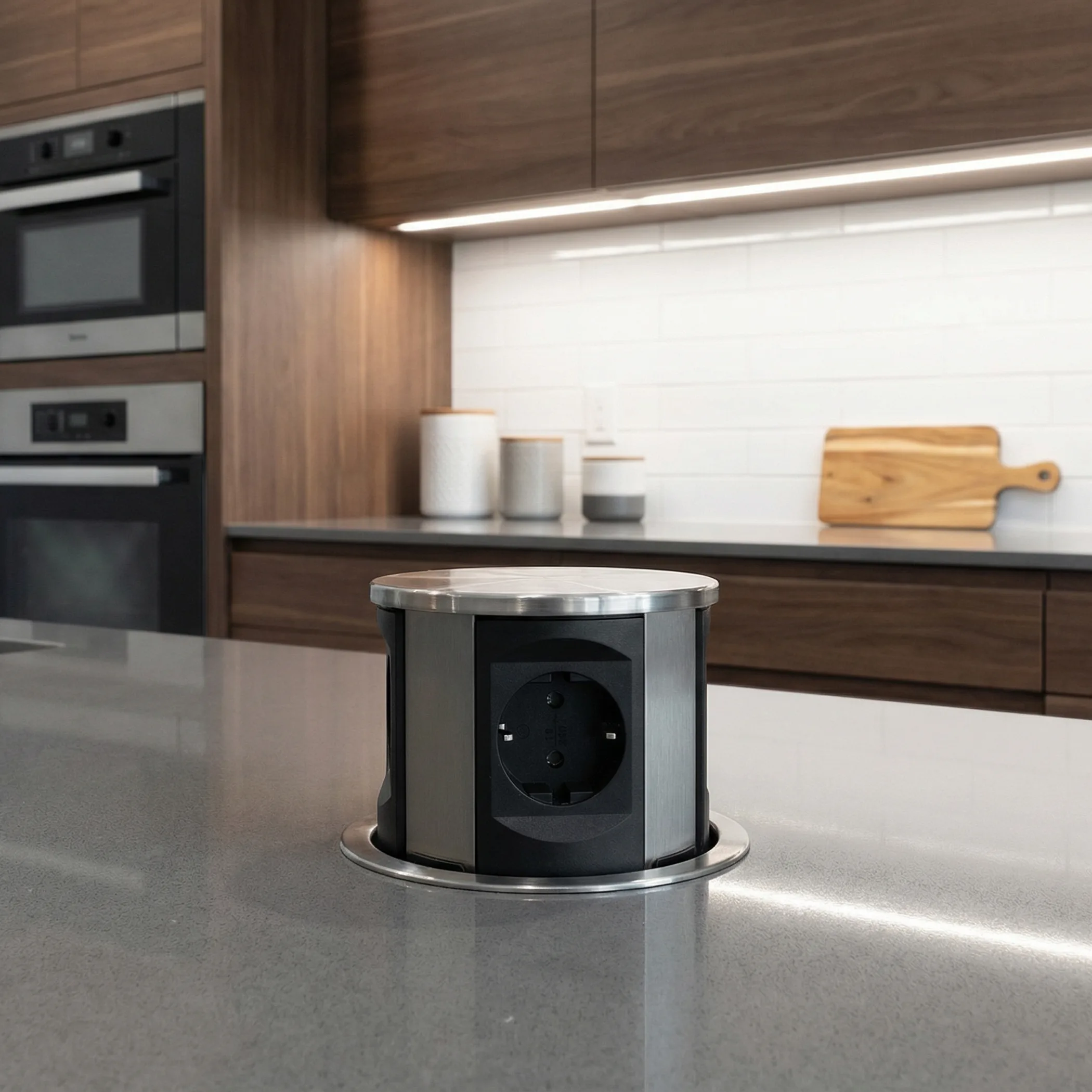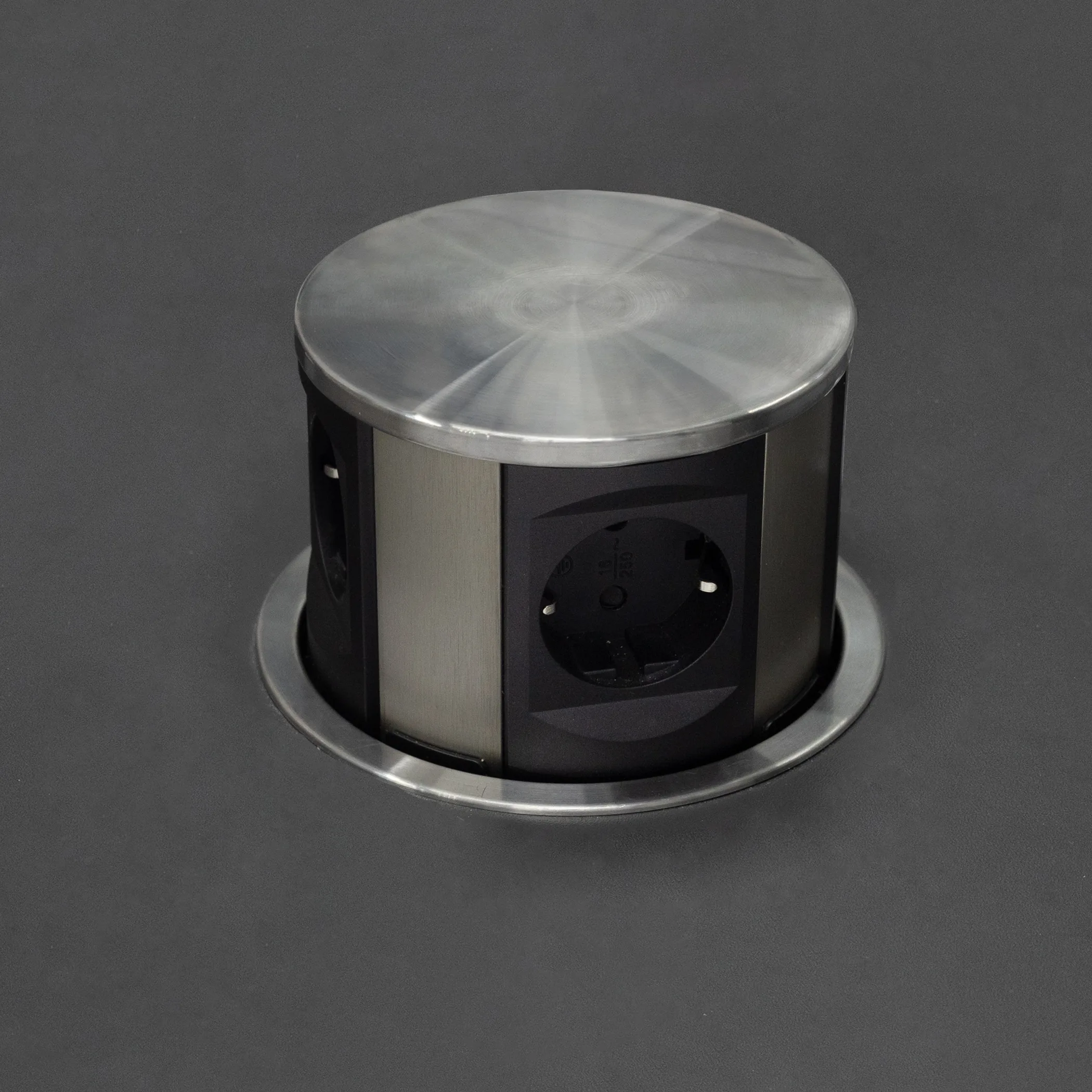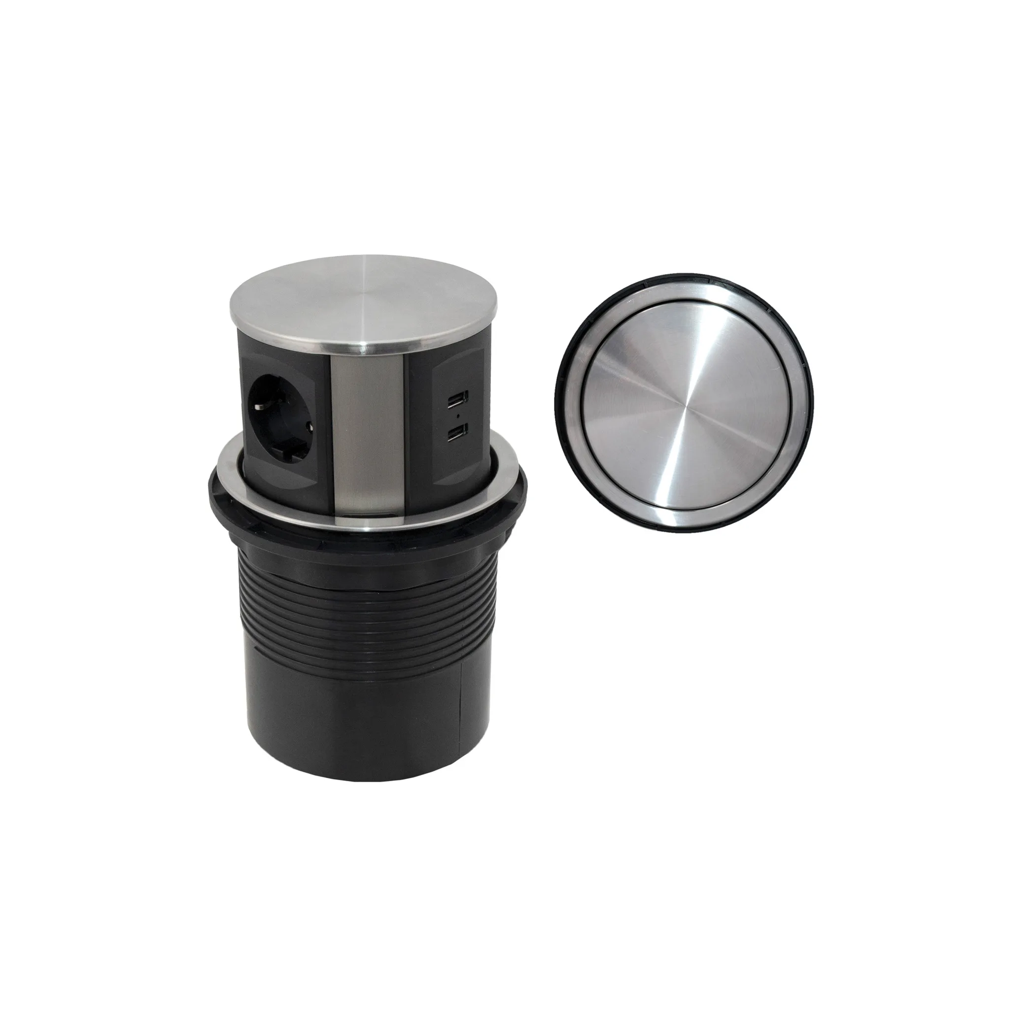 Настольный скрытый разветвитель AKS, 120 мм 3 розетки (Schuko), 2xUSB A, брашированная сталь, тип розеток Schuko, входное напряжение 220В, выходное напряжение 220В, максимальная сила тока 16А, USB выходное напряжение 5В, сила тока 2,4А, максимальная мощность 12Вт, длина шнура 1.8м. Система Push to open - при нажатии сам автоматически поднимается