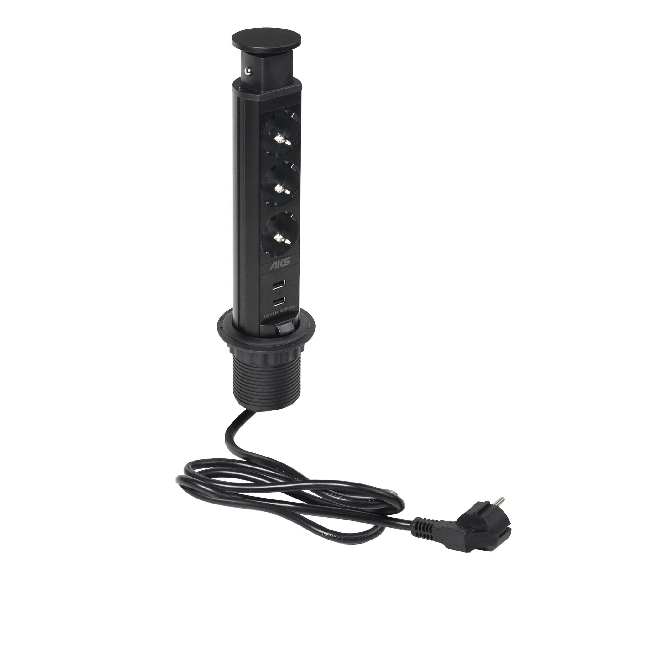 Выдвижной удлинитель Vulcan USB, 60 мм, 3 розетки 2xUSB A, крышка пластик, цвет черный, тип 2, AKS