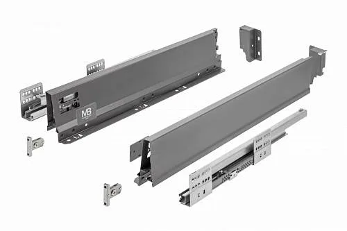 Модерн Бокс PRO , низкий H-84 мм, антрацит — мебельная система выдвижения, представляющая собой набор из направляющих, боковых стенок и рейлингов, для сборки выкатного ящика. Модерн Бокс в первую очередь предназначен для кухонных гарнитуров, но также может быть использован в мебельных конструкциях другого назначения, где конструктивно предусмотрены выдвижные ящики.