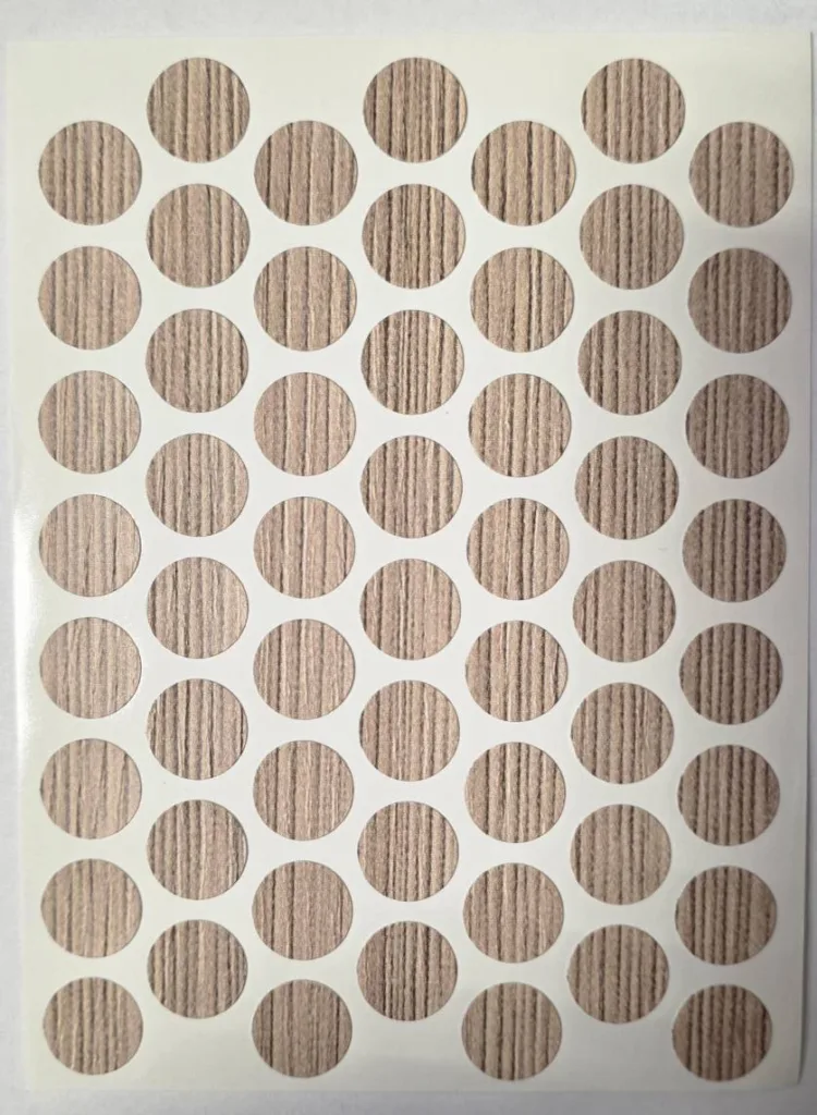 Самоклеящиеся заглушки используются для маскировки головок саморезов, конфирматов (евровинтов) и эксцентриковых стяжек на мебели. Они изготавливаются из тонкого ПВХ или меламина с нанесенным клеевым слоем, что позволяет быстро скрыть крепеж, не увеличивая толщину детали.