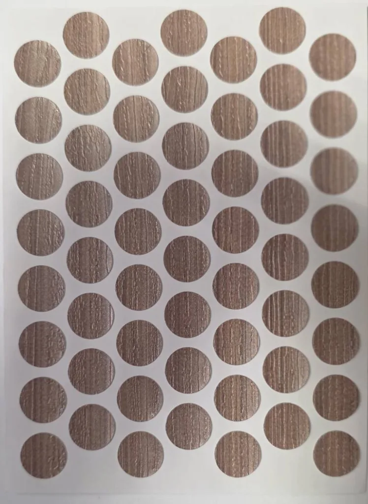 Самоклеящиеся заглушки используются для маскировки головок саморезов, конфирматов (евровинтов) и эксцентриковых стяжек на мебели. Они изготавливаются из тонкого ПВХ или меламина с нанесенным клеевым слоем, что позволяет быстро скрыть крепеж, не увеличивая толщину детали.