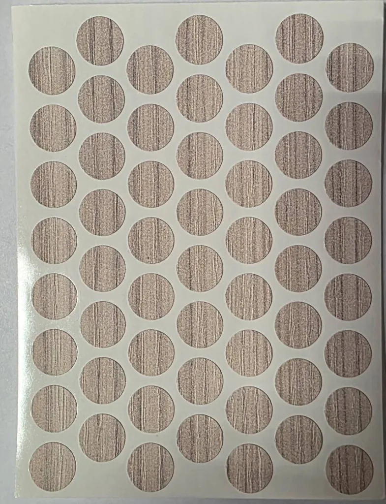 Самоклеящиеся заглушки используются для маскировки головок саморезов, конфирматов (евровинтов) и эксцентриковых стяжек на мебели. Они изготавливаются из тонкого ПВХ или меламина с нанесенным клеевым слоем, что позволяет быстро скрыть крепеж, не увеличивая толщину детали.