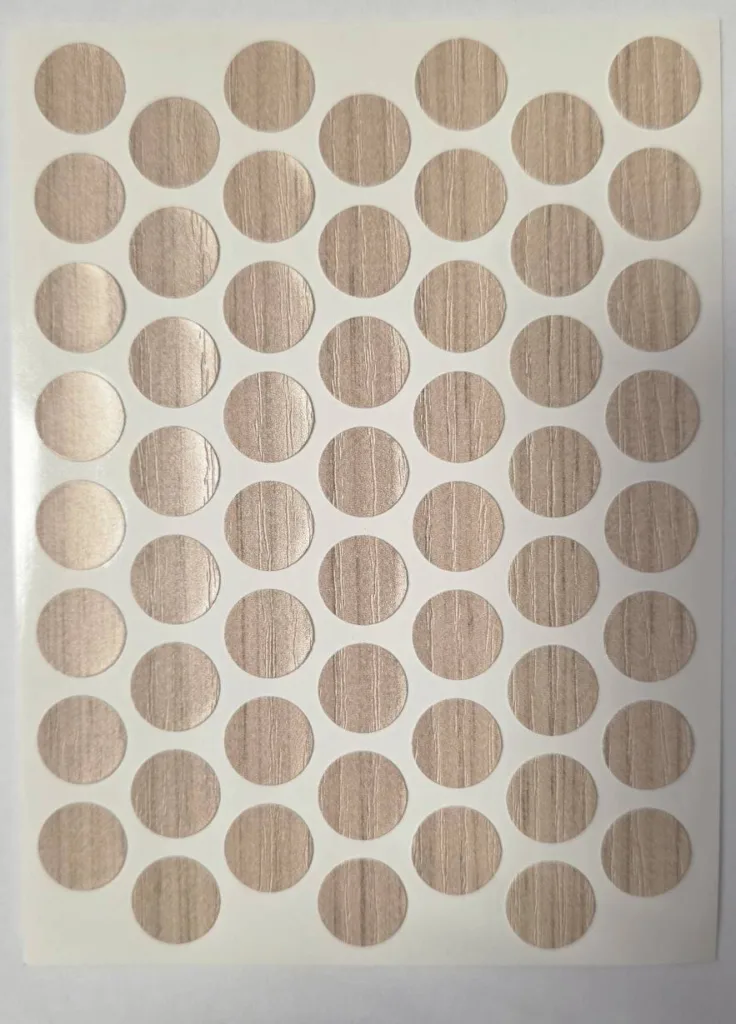 Самоклеящиеся заглушки используются для маскировки головок саморезов, конфирматов (евровинтов) и эксцентриковых стяжек на мебели. Они изготавливаются из тонкого ПВХ или меламина с нанесенным клеевым слоем, что позволяет быстро скрыть крепеж, не увеличивая толщину детали.