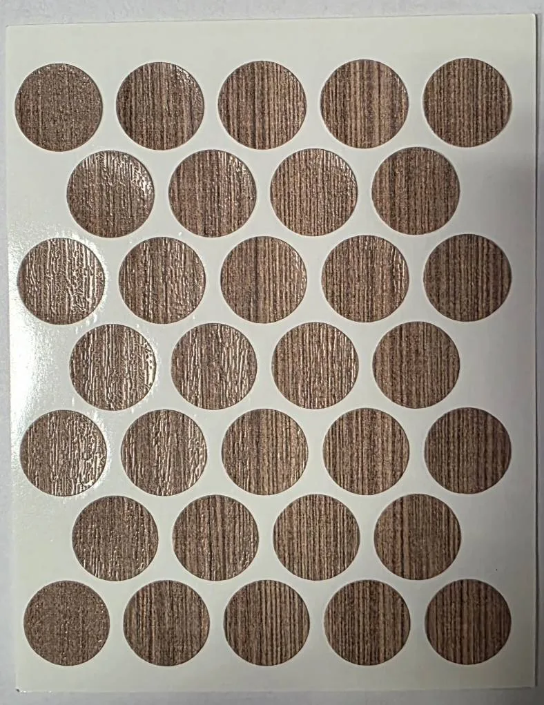 Самоклеящиеся заглушки используются для маскировки головок саморезов, конфирматов (евровинтов) и эксцентриковых стяжек на мебели. Они изготавливаются из тонкого ПВХ или меламина с нанесенным клеевым слоем, что позволяет быстро скрыть крепеж, не увеличивая толщину детали.