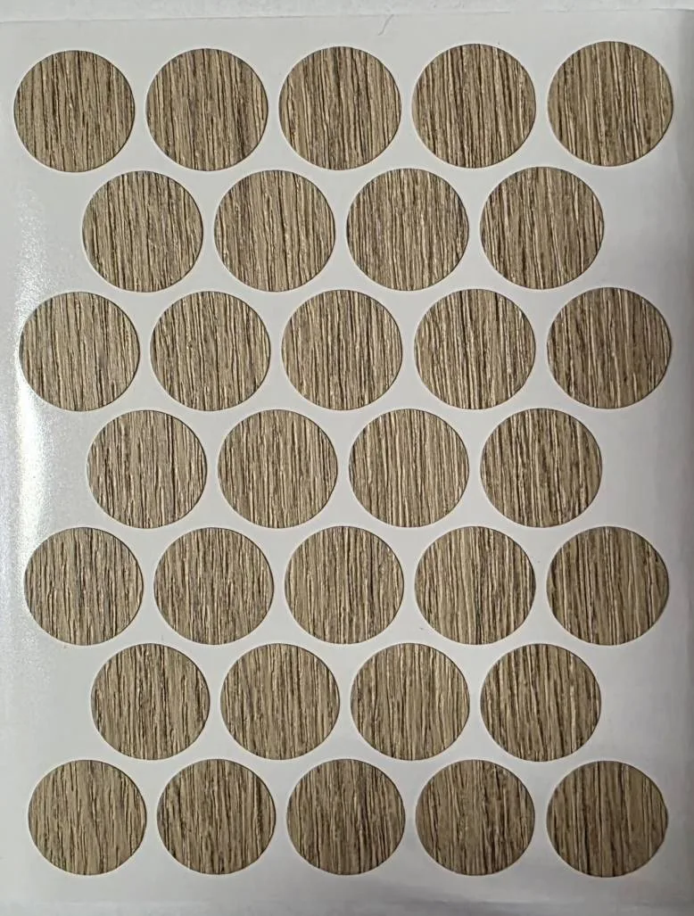 Самоклеящиеся заглушки используются для маскировки головок саморезов, конфирматов (евровинтов) и эксцентриковых стяжек на мебели. Они изготавливаются из тонкого ПВХ или меламина с нанесенным клеевым слоем, что позволяет быстро скрыть крепеж, не увеличивая толщину детали.